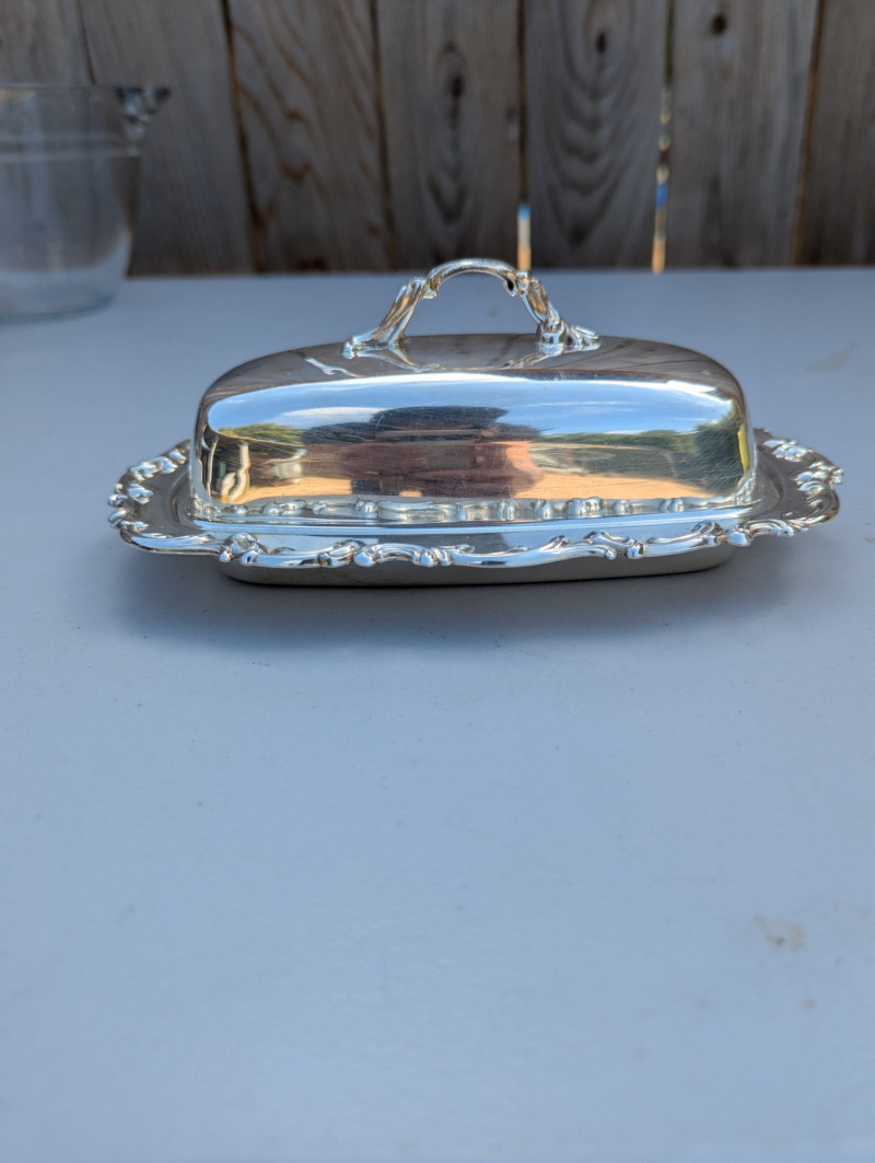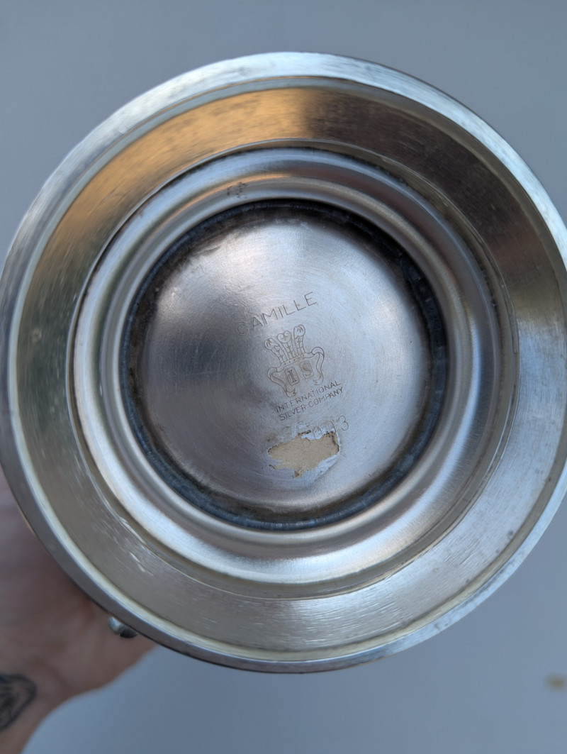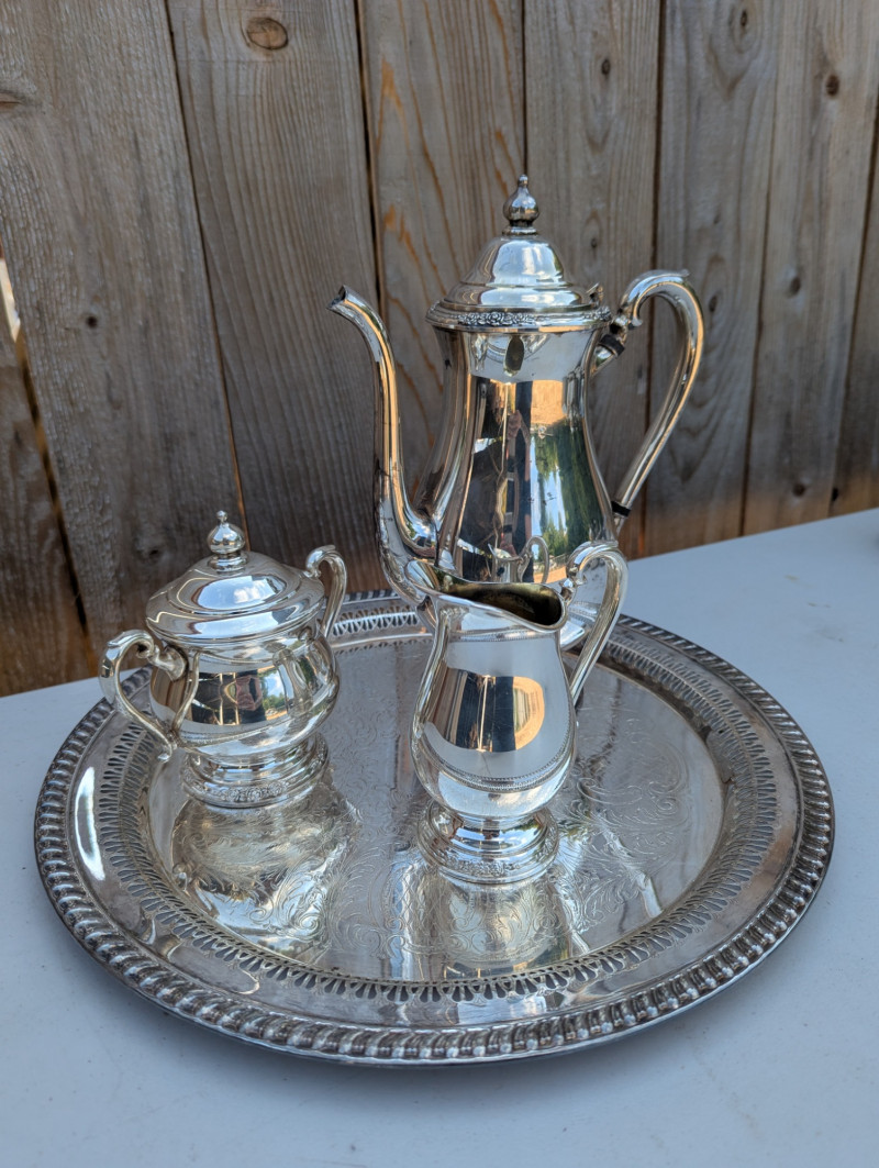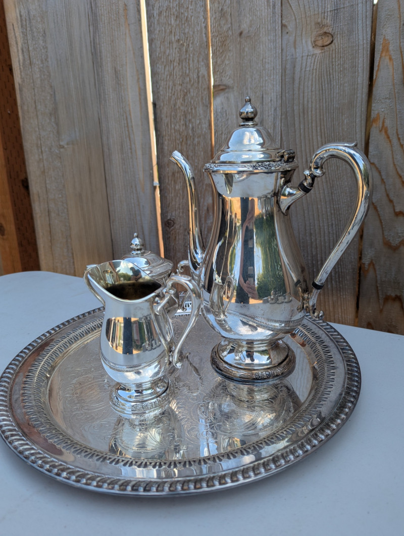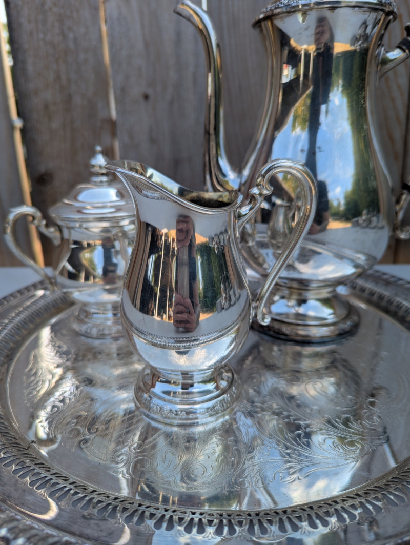 A Gorgeous Camille International Silver Co. (Crown Emblem) teapot set. that includes a teapot, creamer, sugar with lid, butter dish with lid and tray. In very good condition. The Camille pattern was produced by the International Silver Company (ISC) as a silver-plated tea set, possibly in the 20th century, though pinpointing the exact production year is difficult. While the pattern itself might have Victorian or Art Nouveau influences with floral motifs on the rims and bases, one source suggests a 1970s production, while others indicate a 1920-1940 or 1950s timeframe. Would be an excellent Christmas gift!