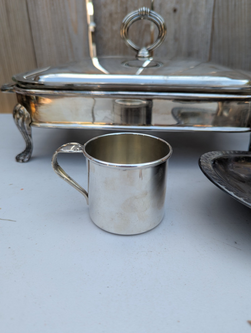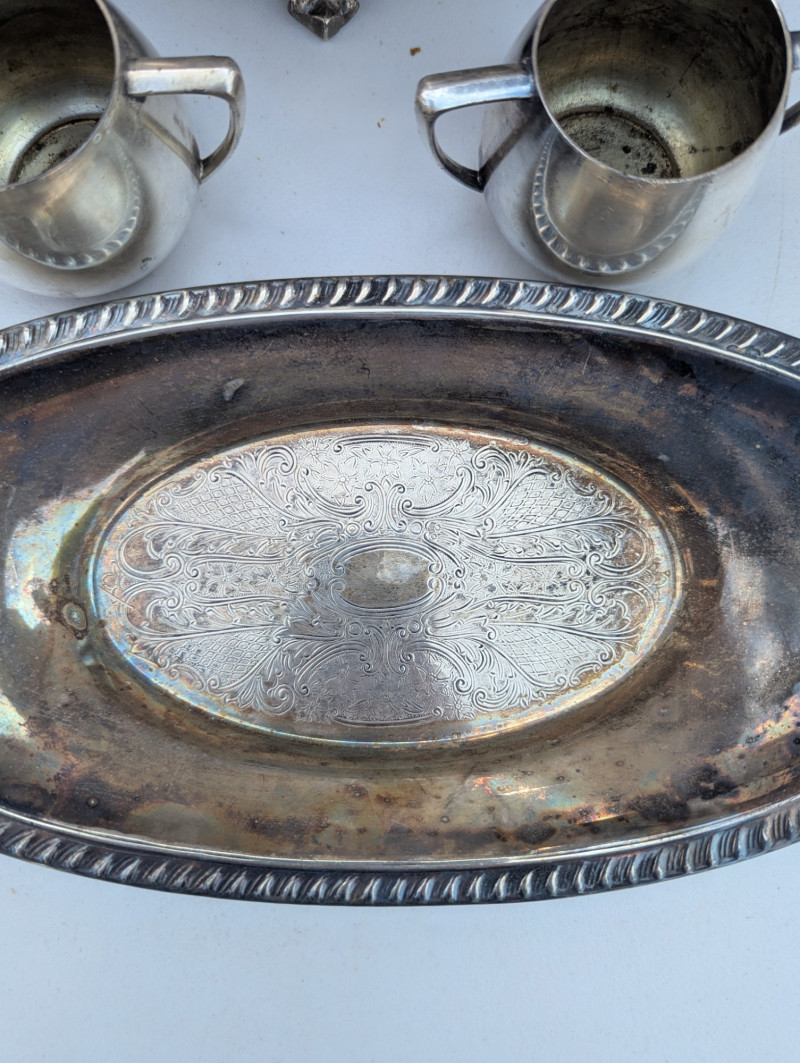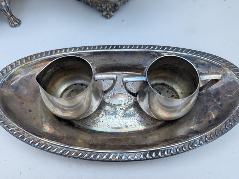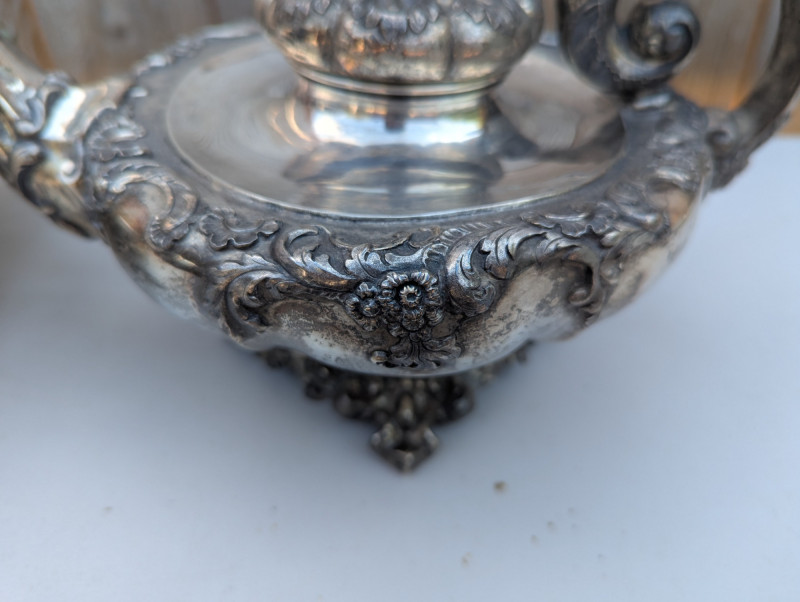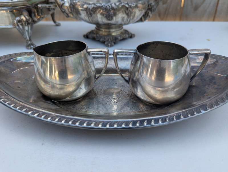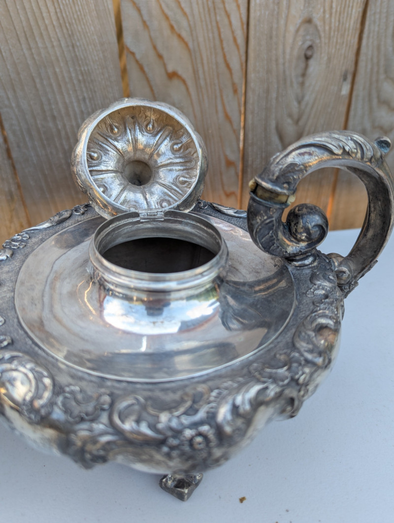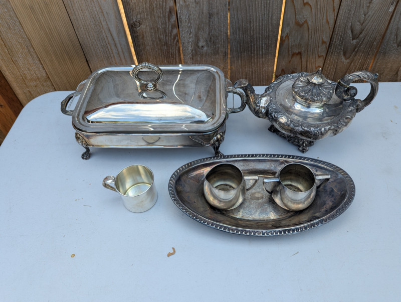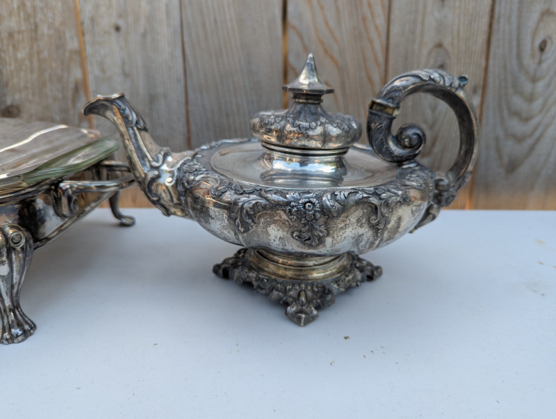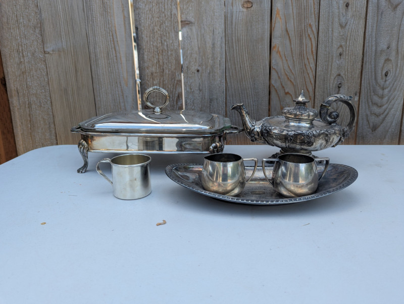 A beautiful collection of mix-matched silver pieces that include: A very detailed/slightly heavy Victorian teapot along with a creamer, sugar without a lid, serving tray, glass casserole dish with silver caddy and a silver teacup. Silver was used for teapots to signify wealth and status, but also for its beneficial properties like water purification and softening, and to preserve tea freshness. Historically, silver teaware was limited to the elite due to its expense. Its historical significance and ability to enhance tea flavor make it a preferred choice for collectors and those seeking a premium tea experience.