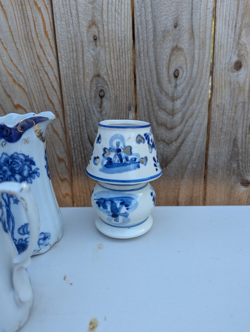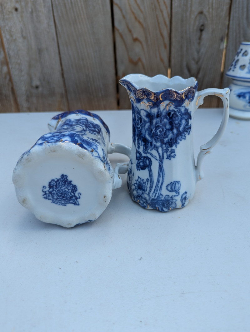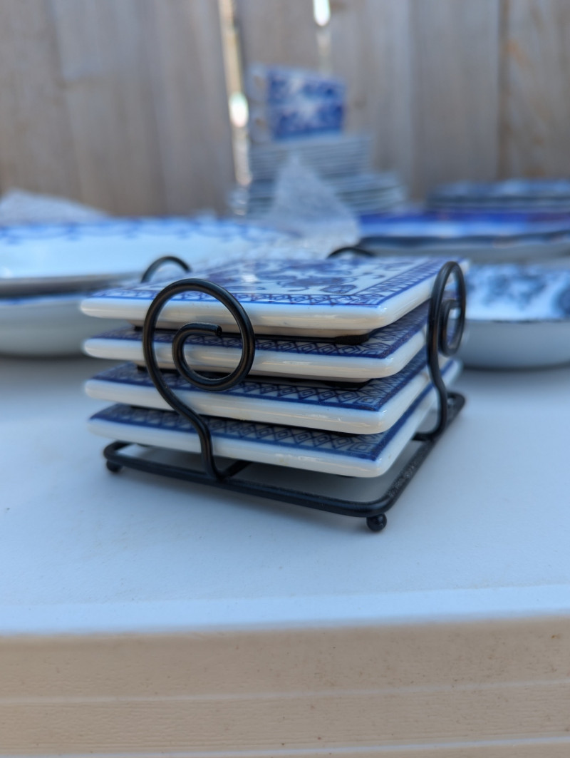 An absolutely gorgeous collection of Blue Floral style dishware with plates, bowls, small pitchers, cups and coasters.