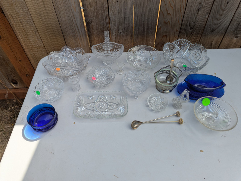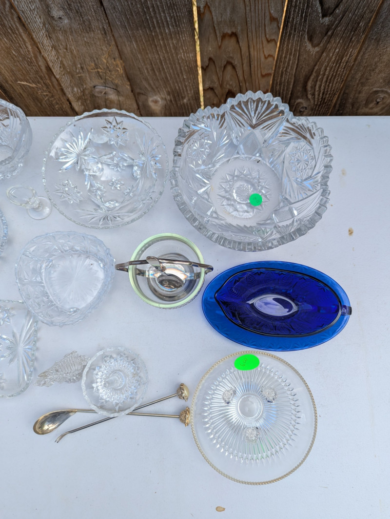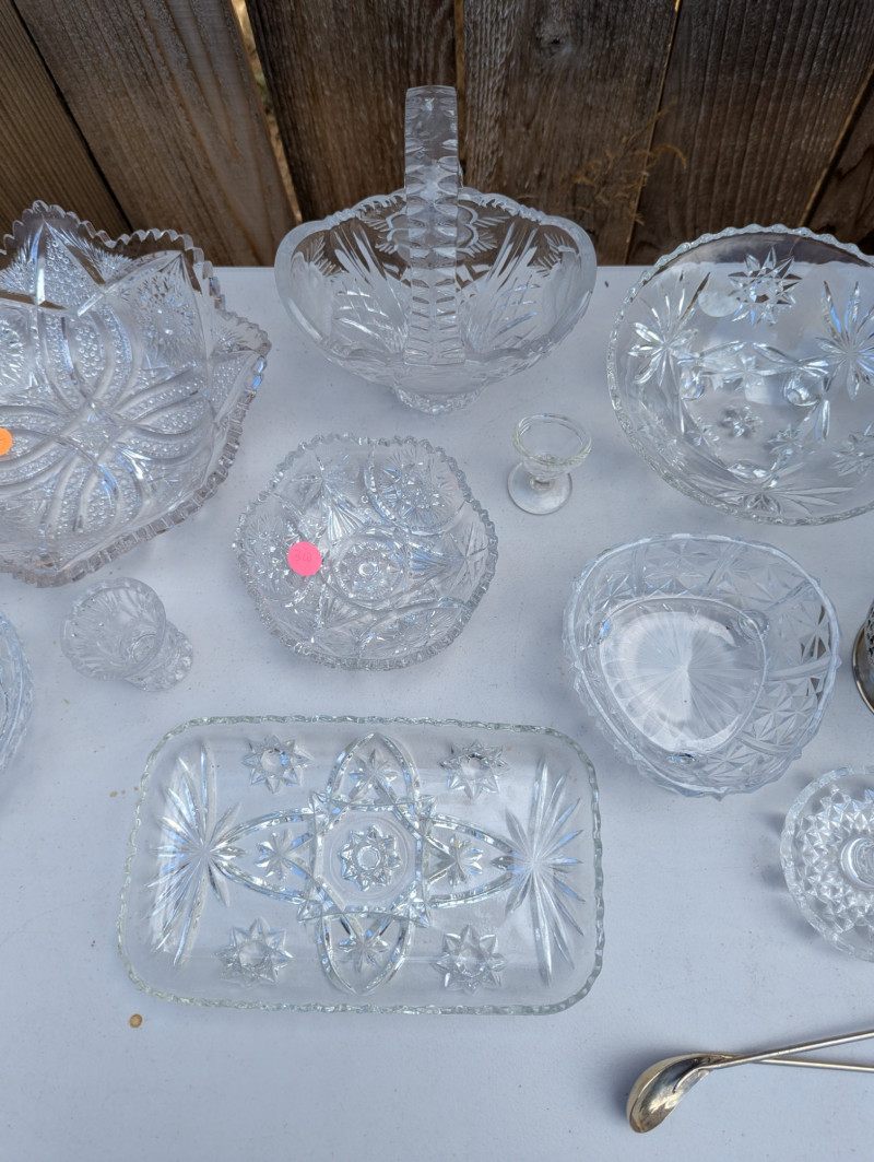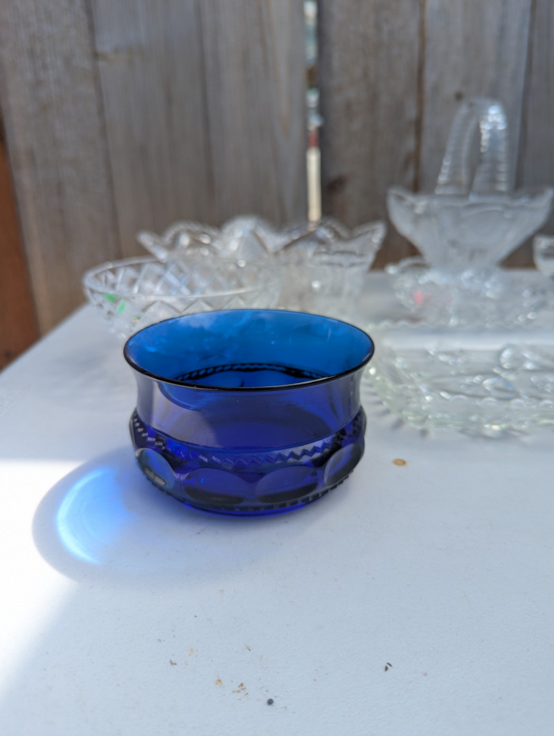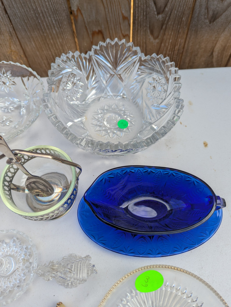 A magnificent set of cut glass/crystal bowl and dishes. Cut glass such as this is from the American Brilliant Period (ABP) that was from 1880-1925. In contrast to pressed glass, cut glass designs will feel deep, narrow-cut, and heavy. There are 3 candy dishes, 4 large fruit bowls, a condiment serving tray, silver and glass sugar bowl with attachable spoon, a gorgeous sapphire colored gravy boat, a ring plate and a few more "brilliant" pieces!