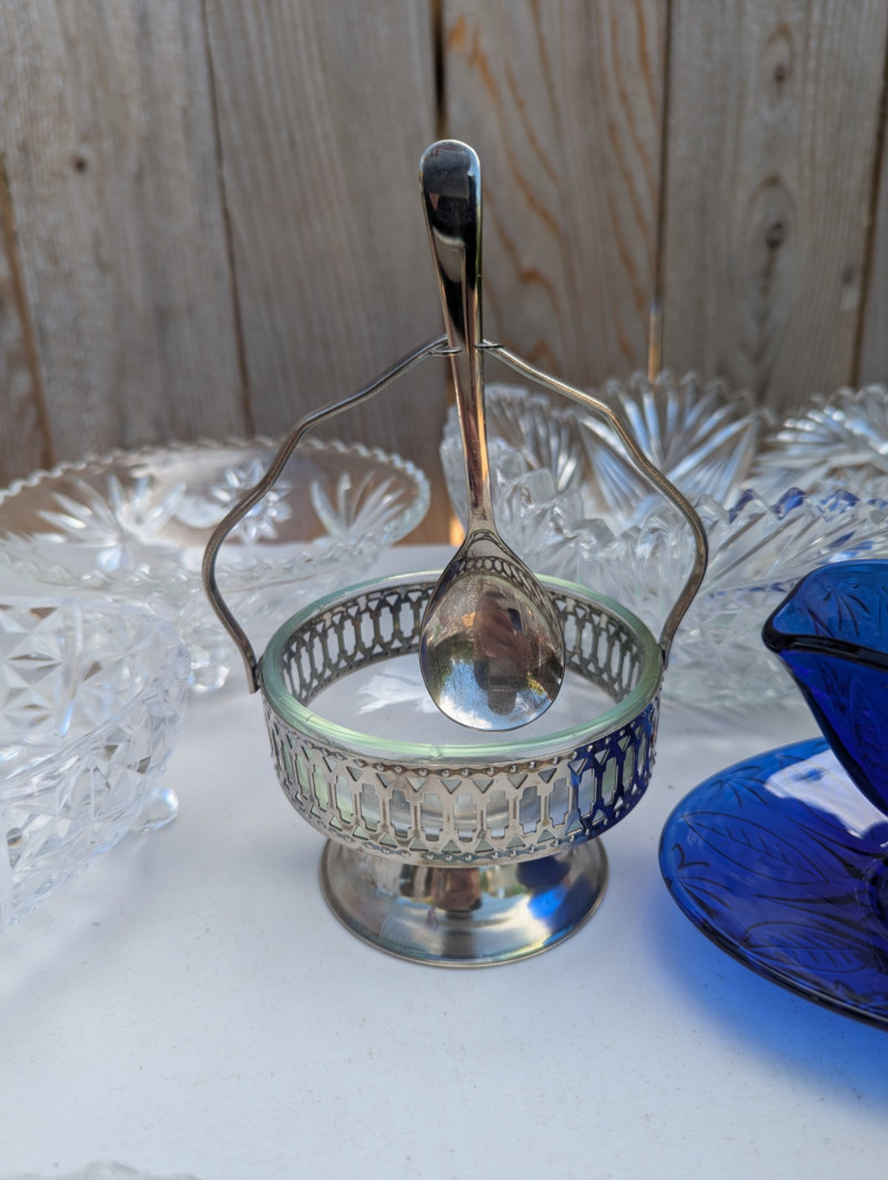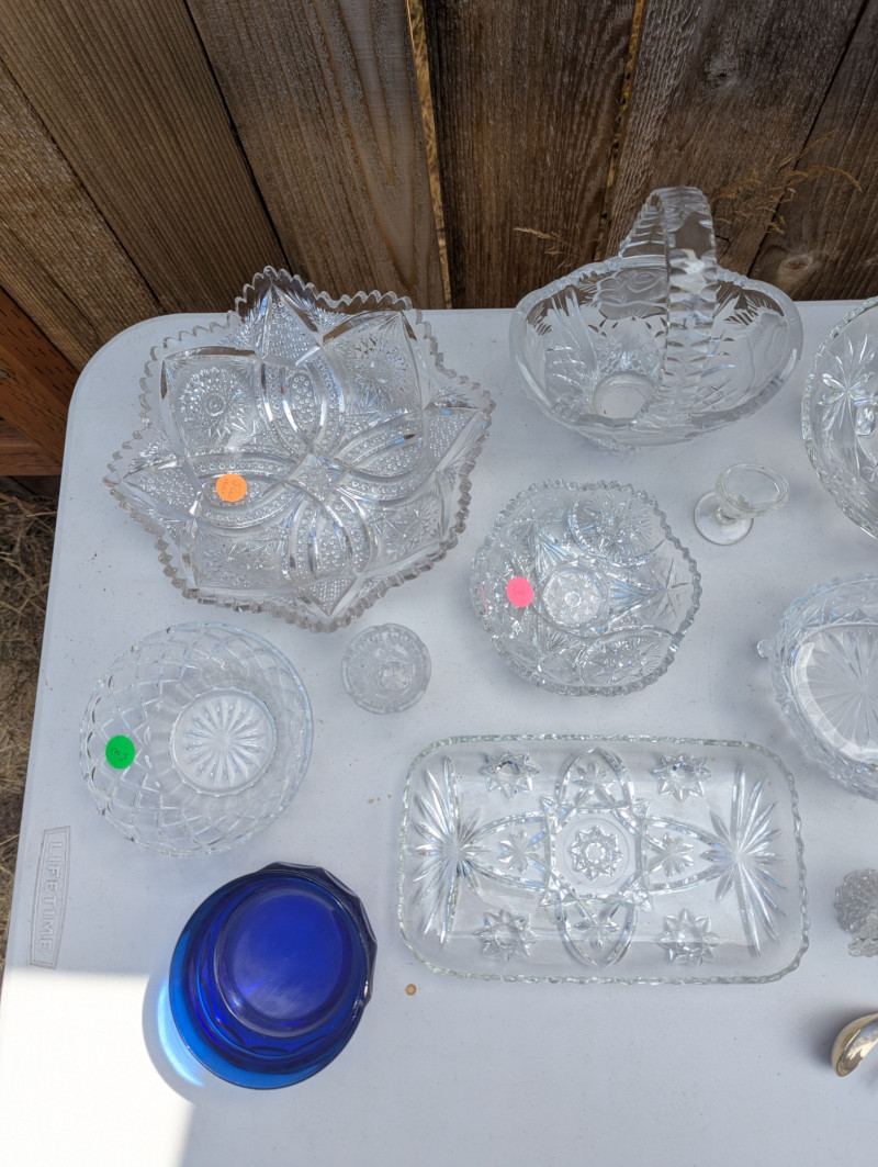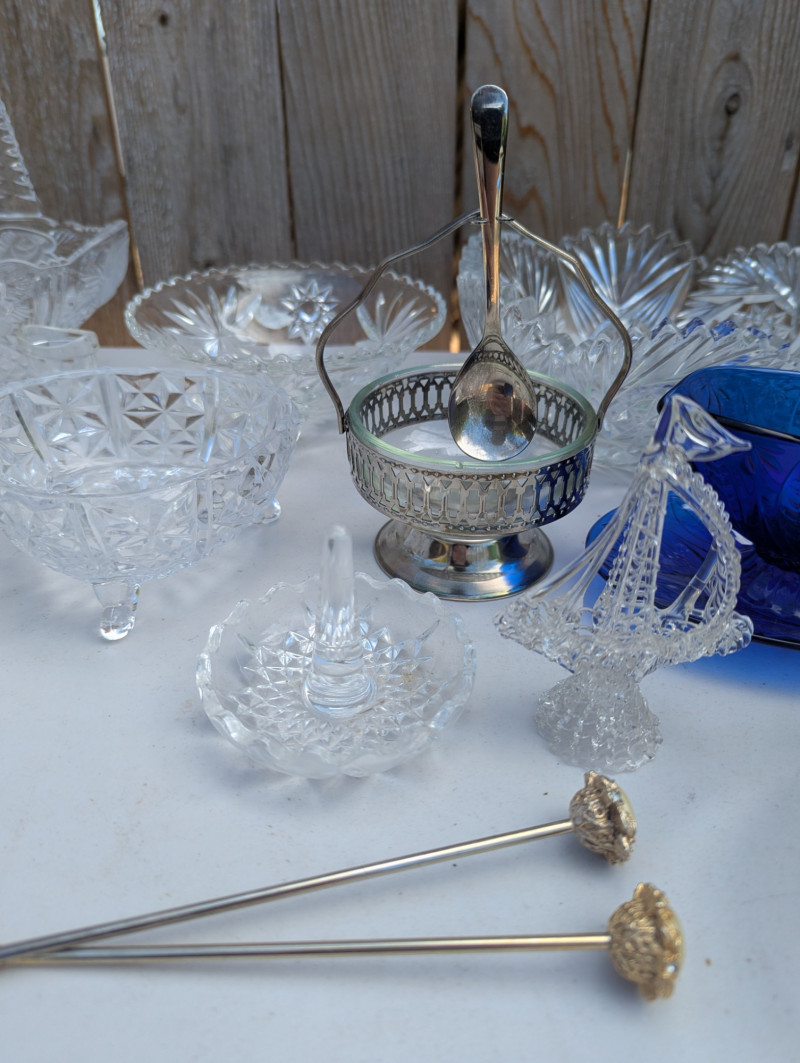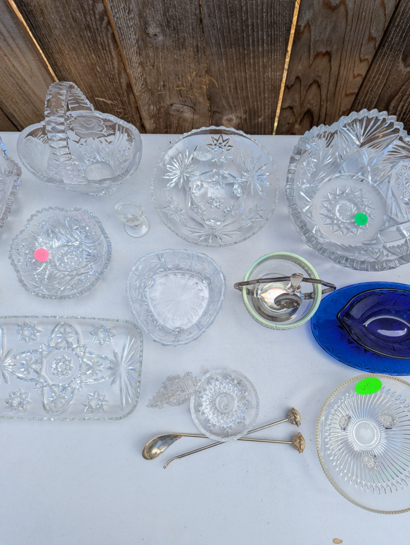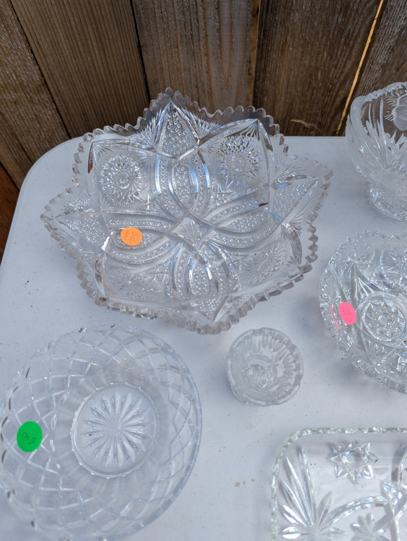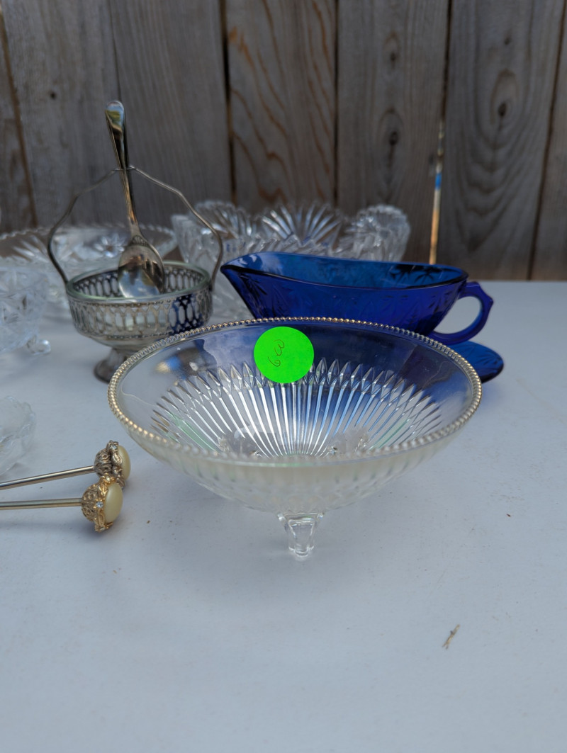 A magnificent set of cut glass/crystal bowl and dishes. Cut glass such as this is from the American Brilliant Period (ABP) that was from 1880-1925. In contrast to pressed glass, cut glass designs will feel deep, narrow-cut, and heavy. There are 3 candy dishes, 4 large fruit bowls, a condiment serving tray, silver and glass sugar bowl with attachable spoon, a gorgeous sapphire colored gravy boat, a ring plate and a few more "brilliant" pieces!