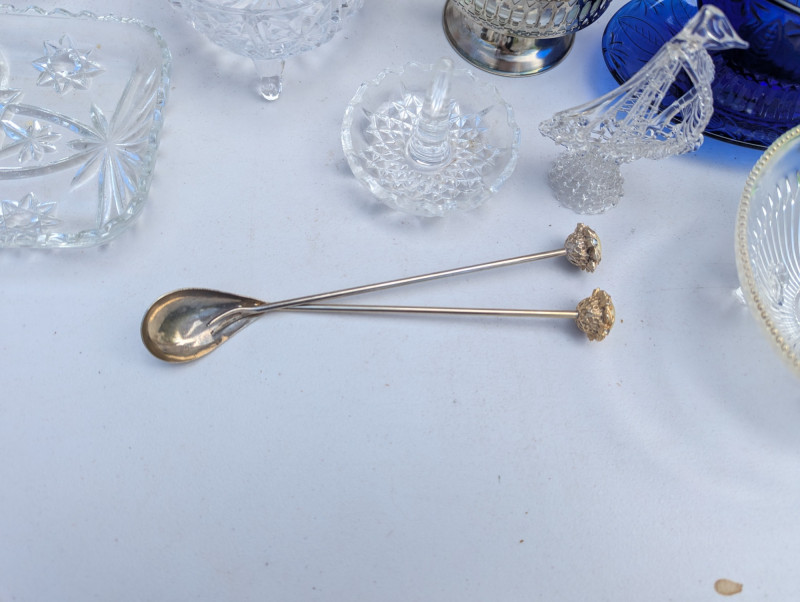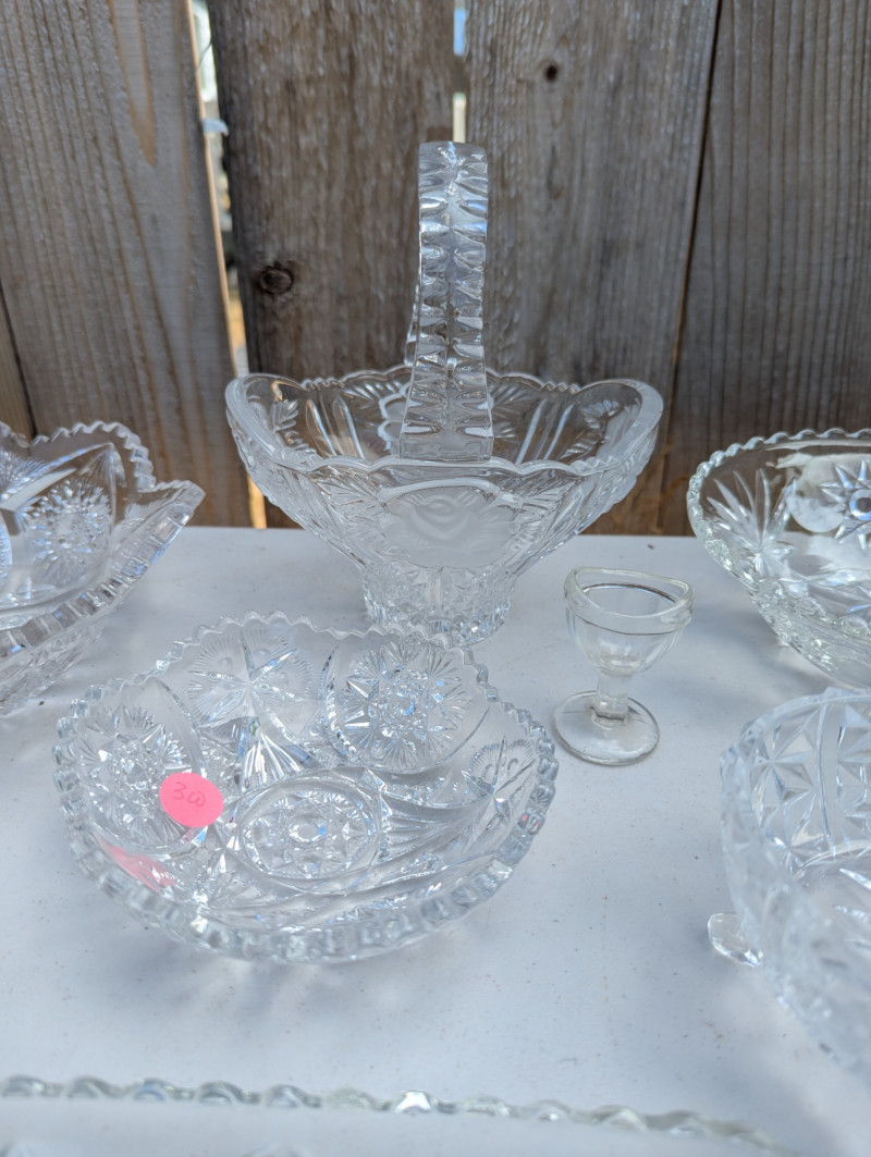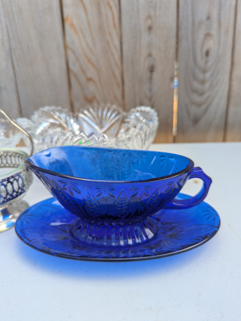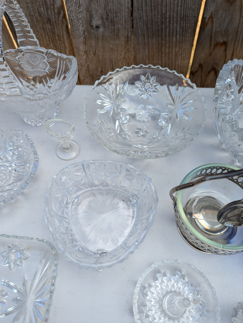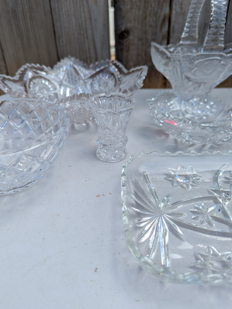 A magnificent set of cut glass/crystal bowl and dishes. Cut glass such as this is from the American Brilliant Period (ABP) that was from 1880-1925. In contrast to pressed glass, cut glass designs will feel deep, narrow-cut, and heavy. There are 3 candy dishes, 4 large fruit bowls, a condiment serving tray, silver and glass sugar bowl with attachable spoon, a gorgeous sapphire colored gravy boat, a ring plate and a few more "brilliant" pieces!