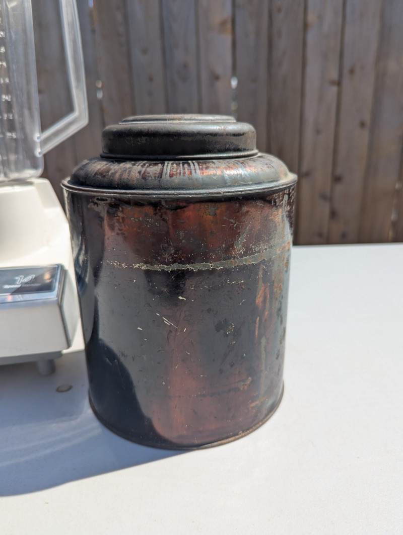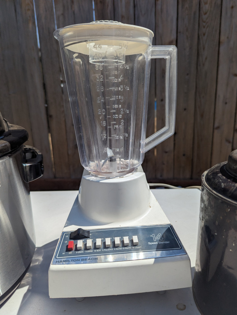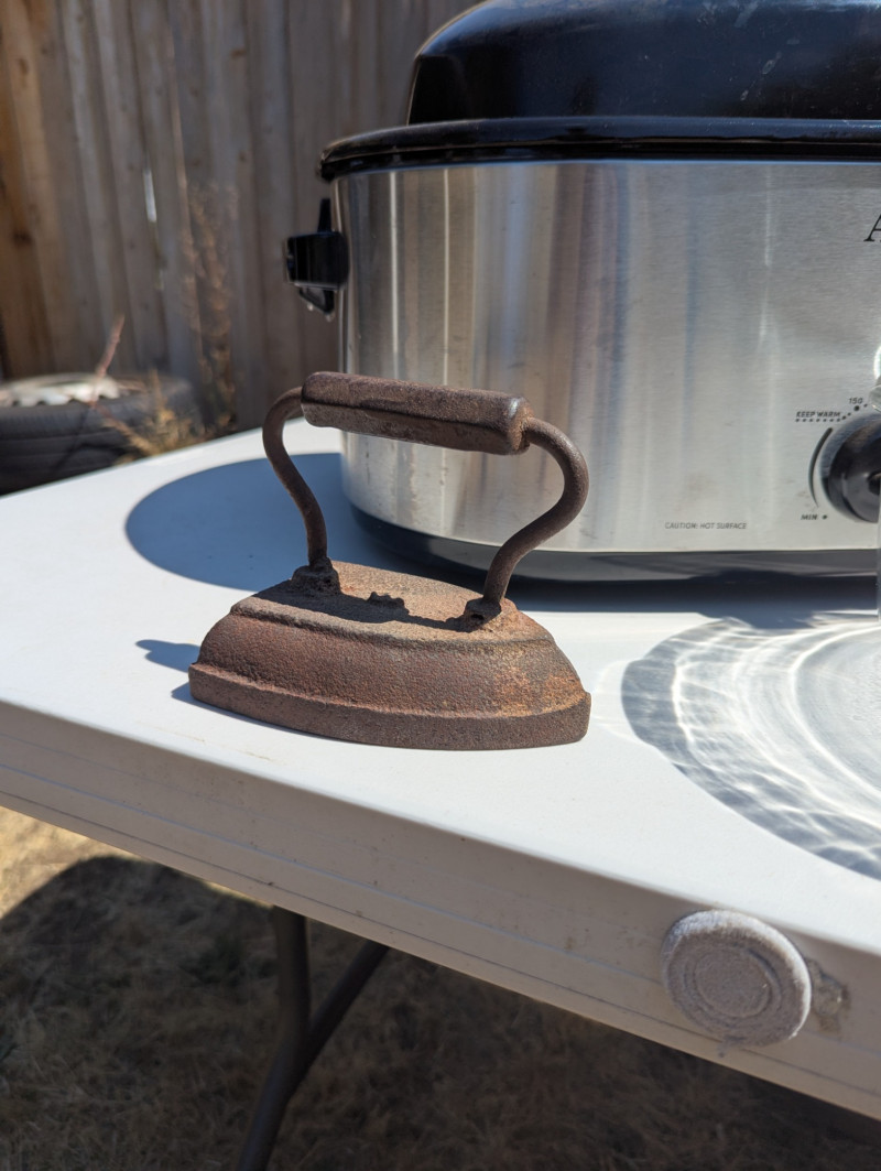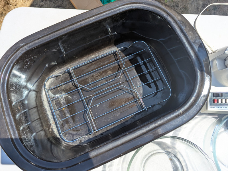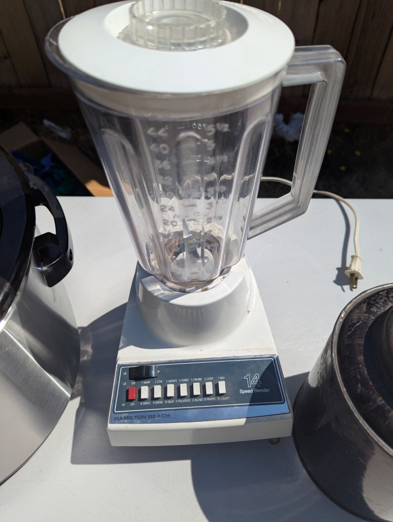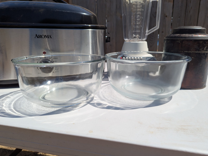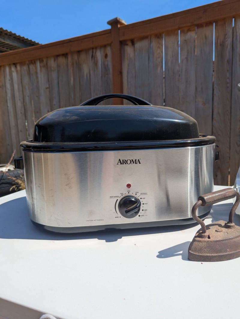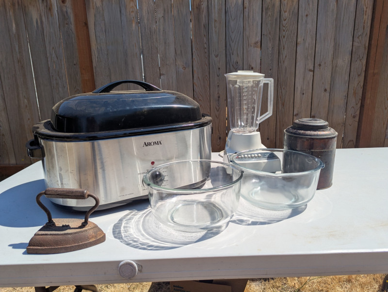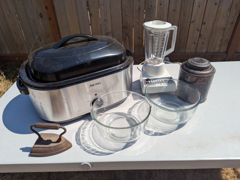 Hardly used Giant Slow Cooker that would be perfect for a roast, turkey or whole chicken dinners. Along with a plastic blender, two glass mixing bowls, and old fashioned iron and a canister.
