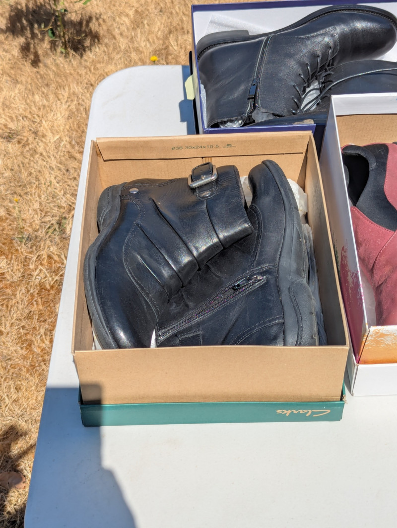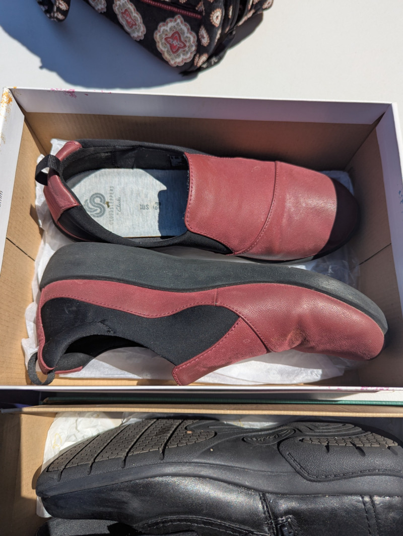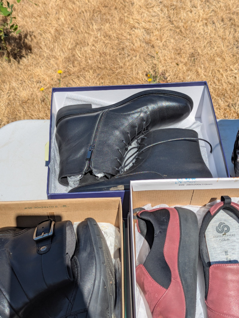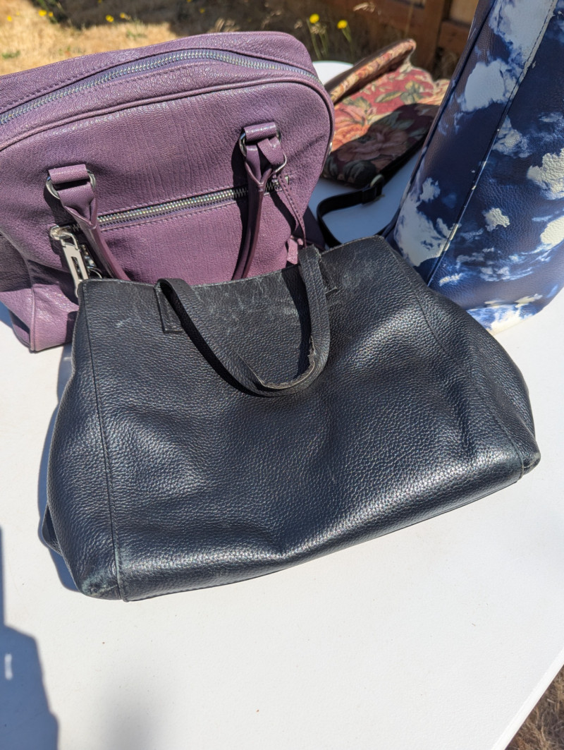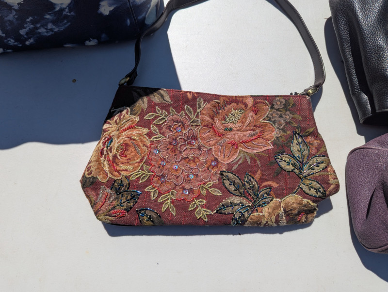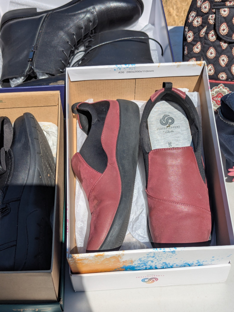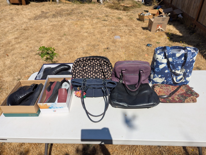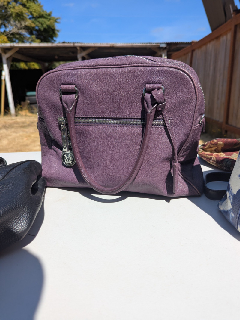 There are two Kate Spade Purses, one is Black and the other is Skyblue with clouds. There is one Purple Michael Kors purse. One Blue Brighten purse. And two fabric/carpet style purses. Then All shoes are a women's 8.5. All are in pretty good condition. Most look barely used.