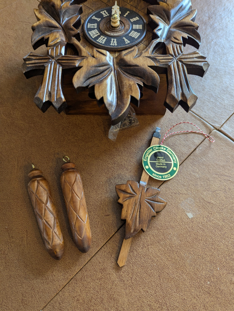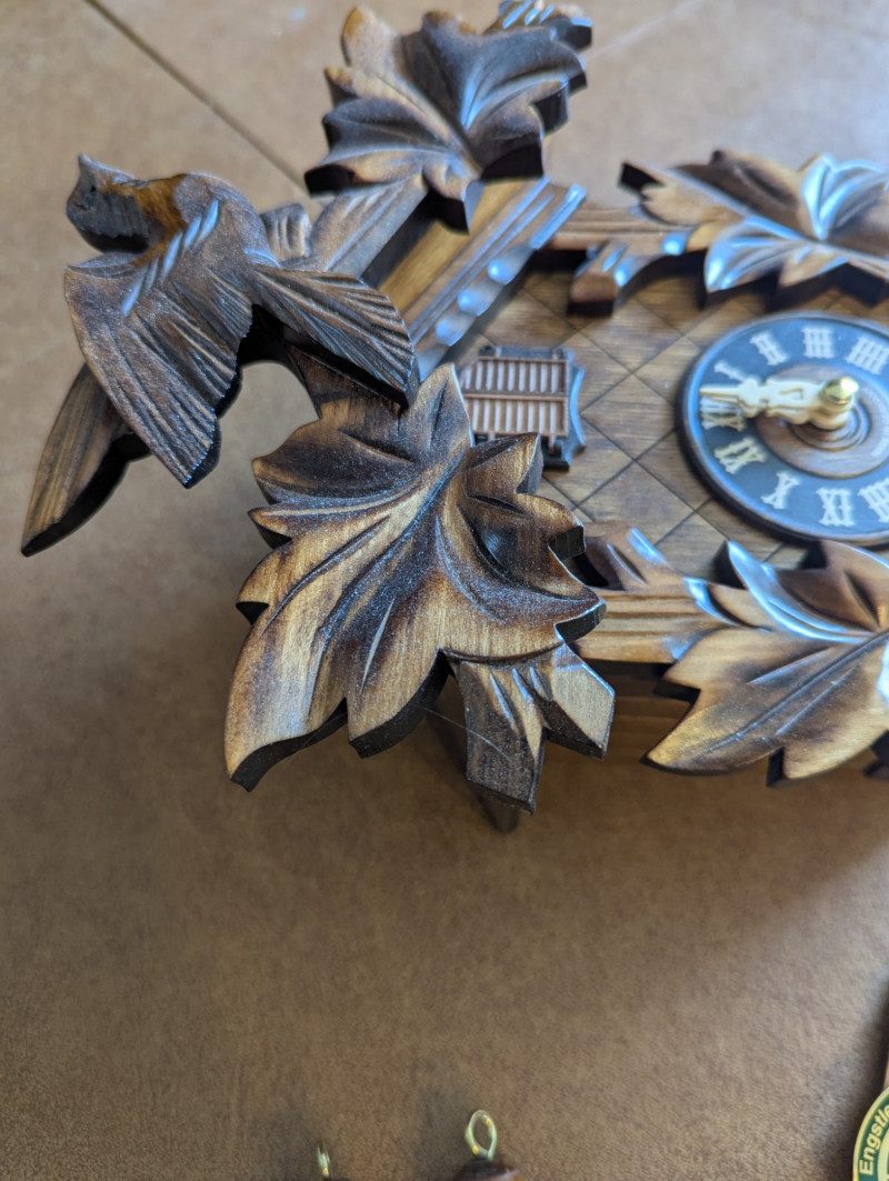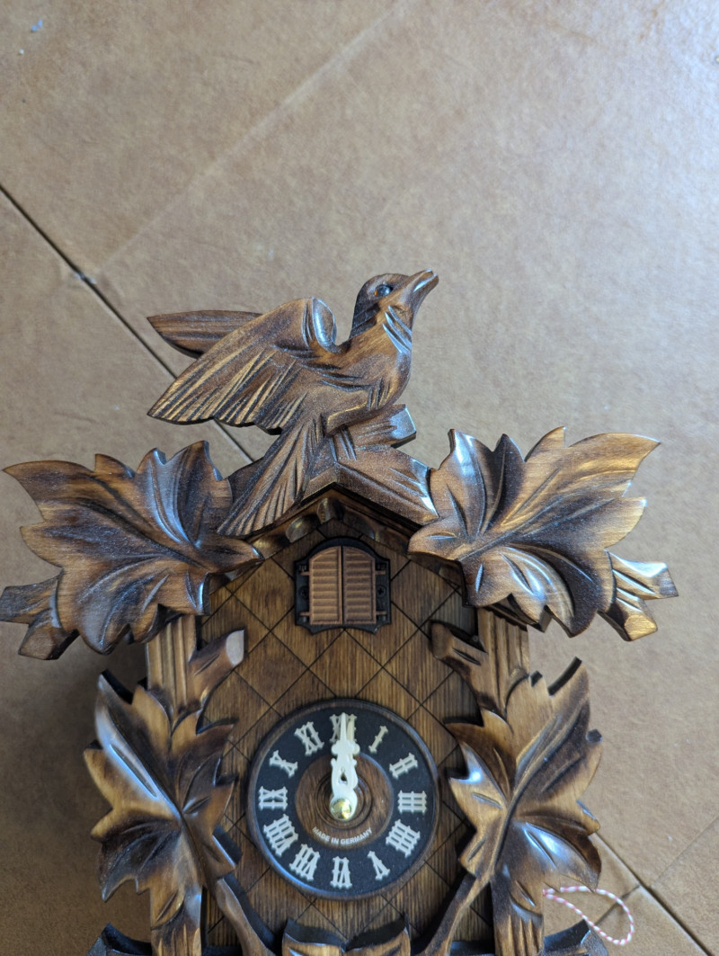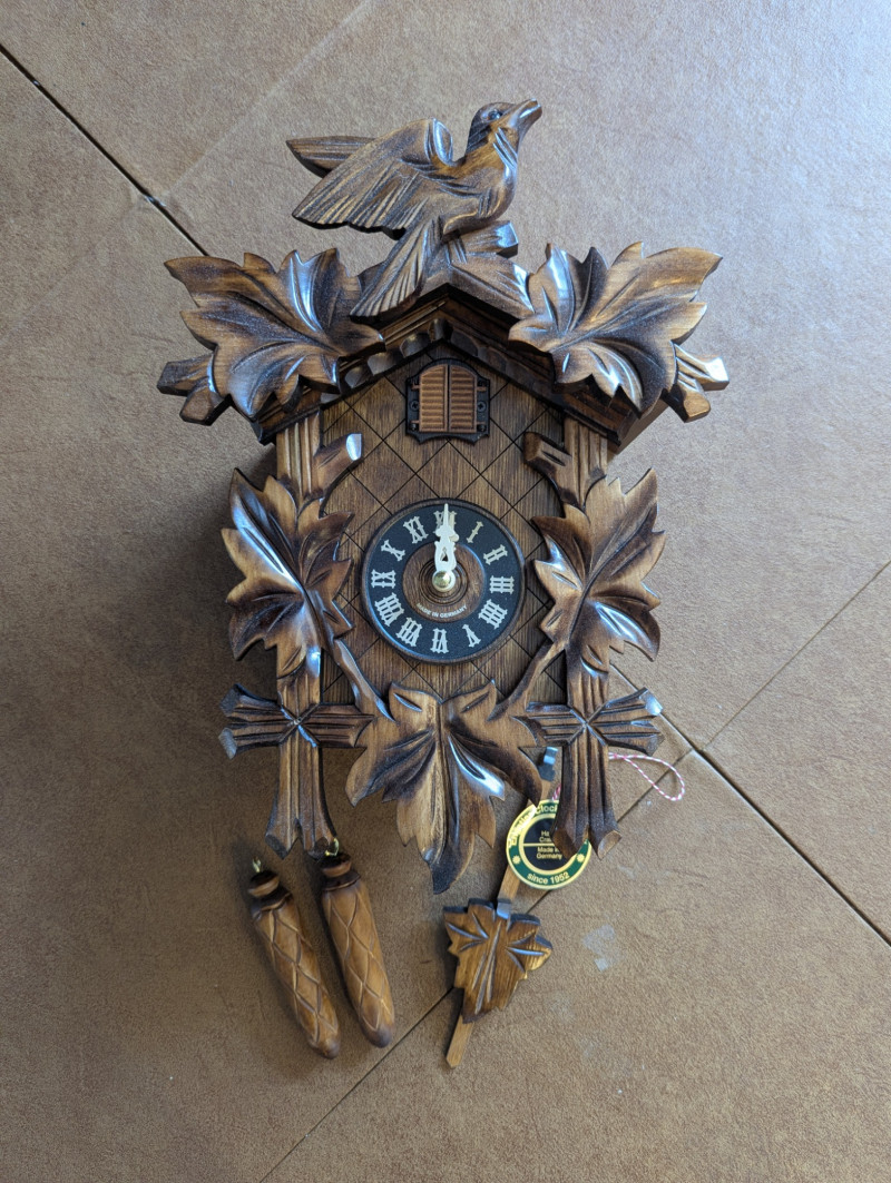 Brand New! A gorgeous, fully functional, wooden coocoo clock made in Germany. This clock is made by Engstler Clocks. They're a cuckoo clock manufacturer based in Villingen-Schwenningen, Germany, founded by Josef Engstler in 1952 and now run by the third generation. The company produces both traditional mechanical and modern quartz cuckoo clocks, combining old-world craftsmanship with current technology This would be an excellent addition to your winter cottage, hunting lounge or country kitchen. It's hand carved and is lightweight so hanging it should be a breeze.