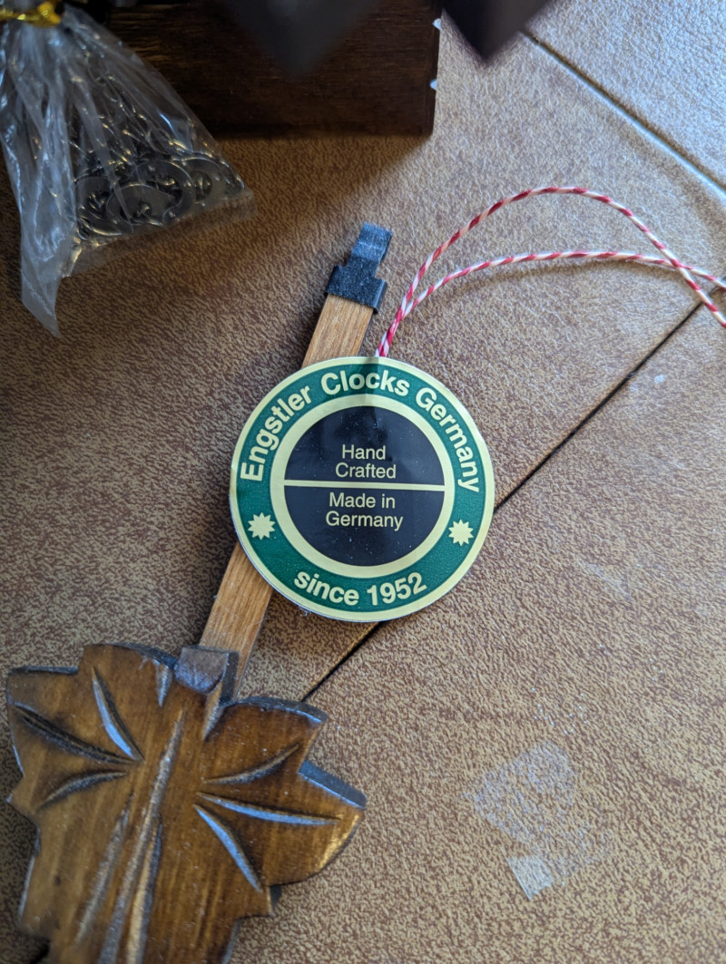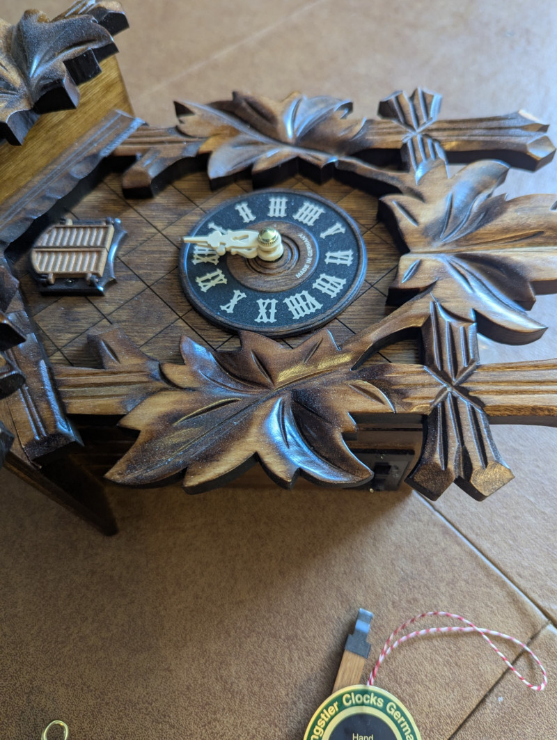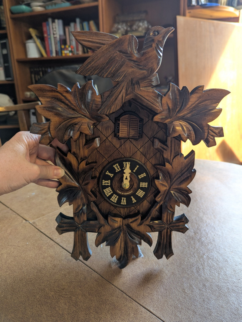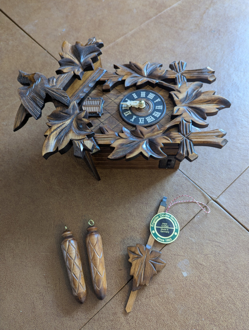 Brand New! A gorgeous, fully functional, wooden coocoo clock made in Germany. This clock is made by Engstler Clocks. They're a cuckoo clock manufacturer based in Villingen-Schwenningen, Germany, founded by Josef Engstler in 1952 and now run by the third generation. The company produces both traditional mechanical and modern quartz cuckoo clocks, combining old-world craftsmanship with current technology This would be an excellent addition to your winter cottage, hunting lounge or country kitchen. It's hand carved and is lightweight so hanging it should be a breeze.