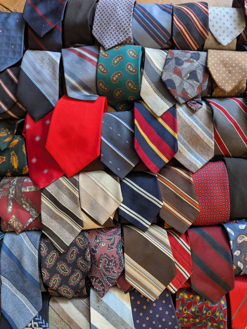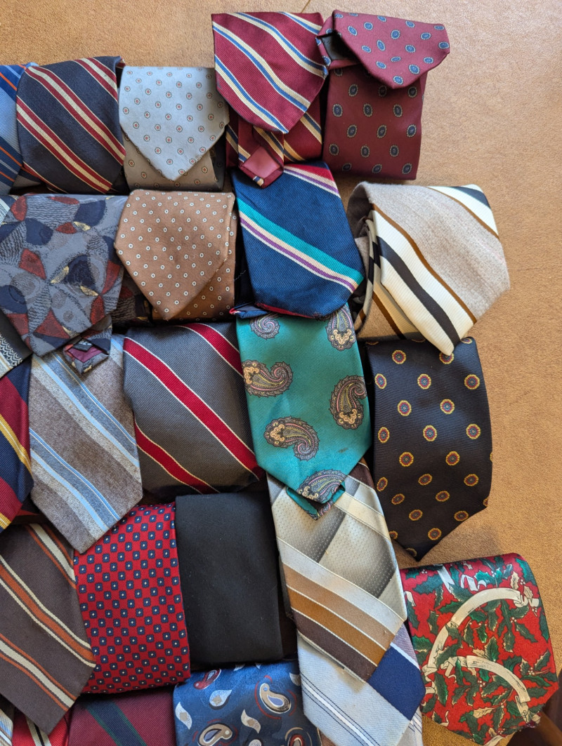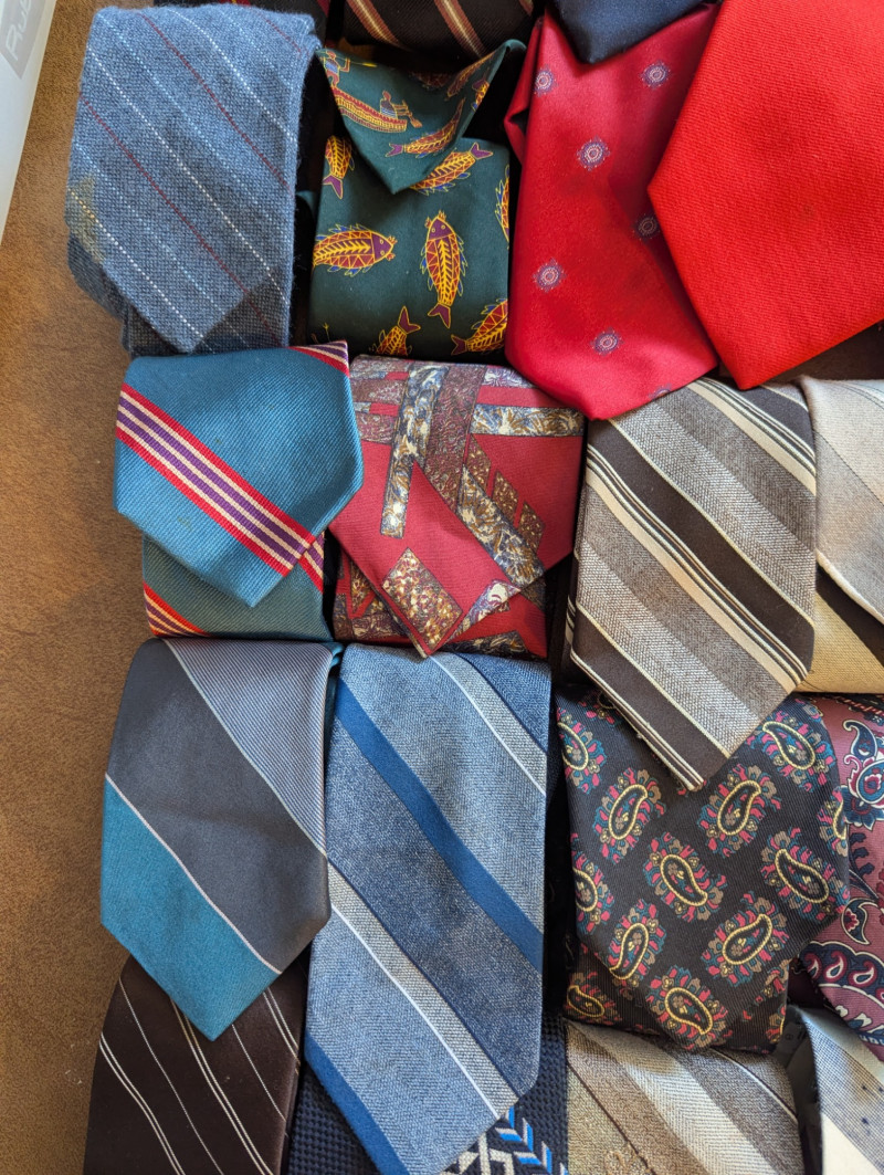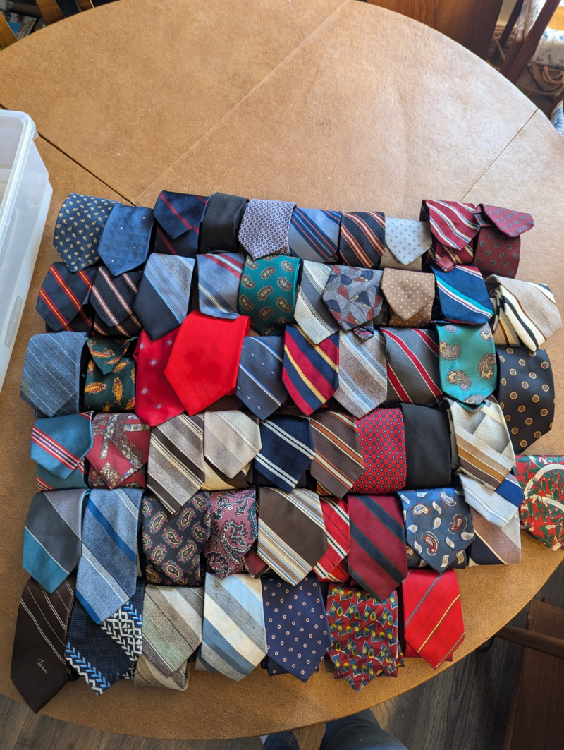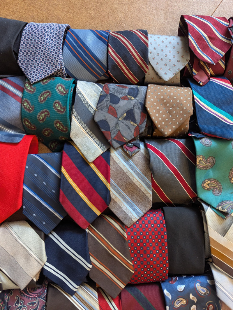 A father or gandfather's dream! 56 neck ties all in good condition. You can have a tie for each day of the month! These would also be great for any fabric savvy folks who can turn them into hairties, sunglass holders, skirts or use them in scrapbooking.