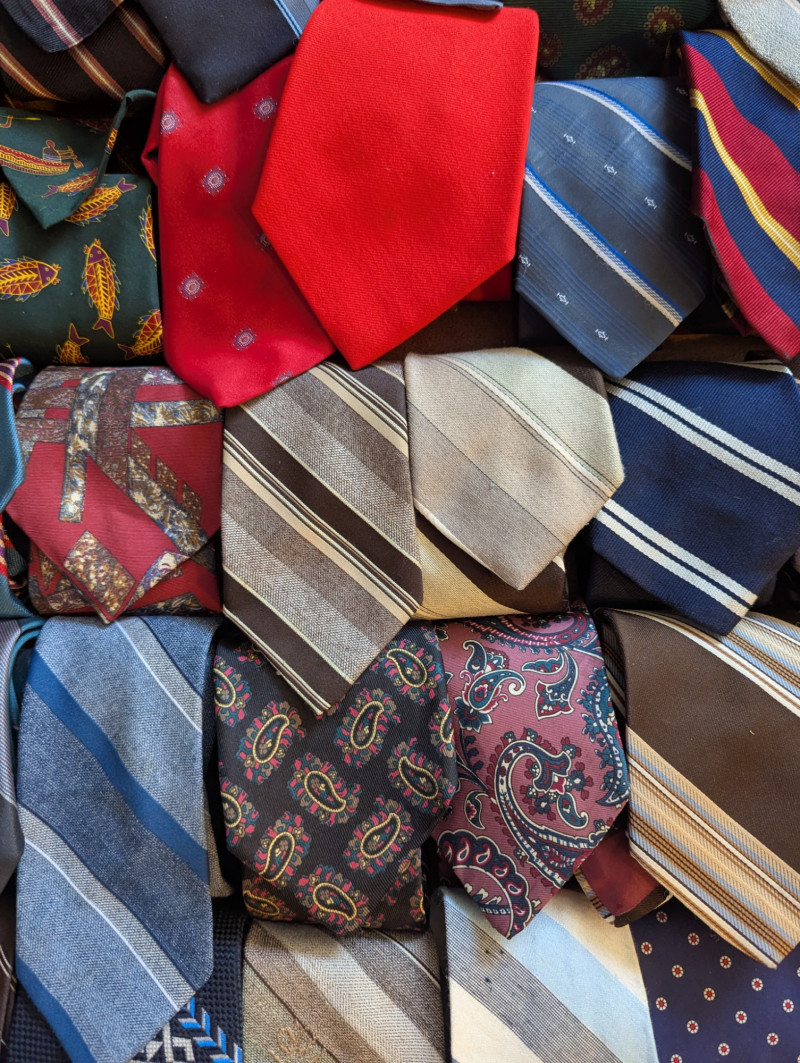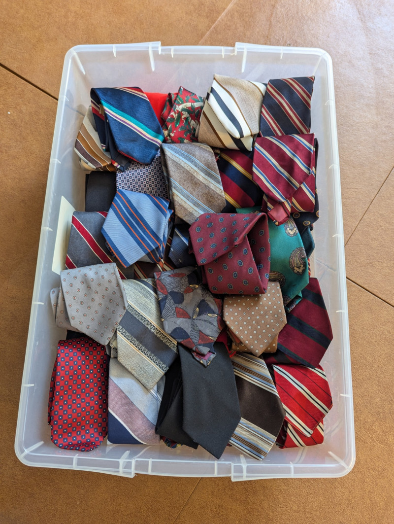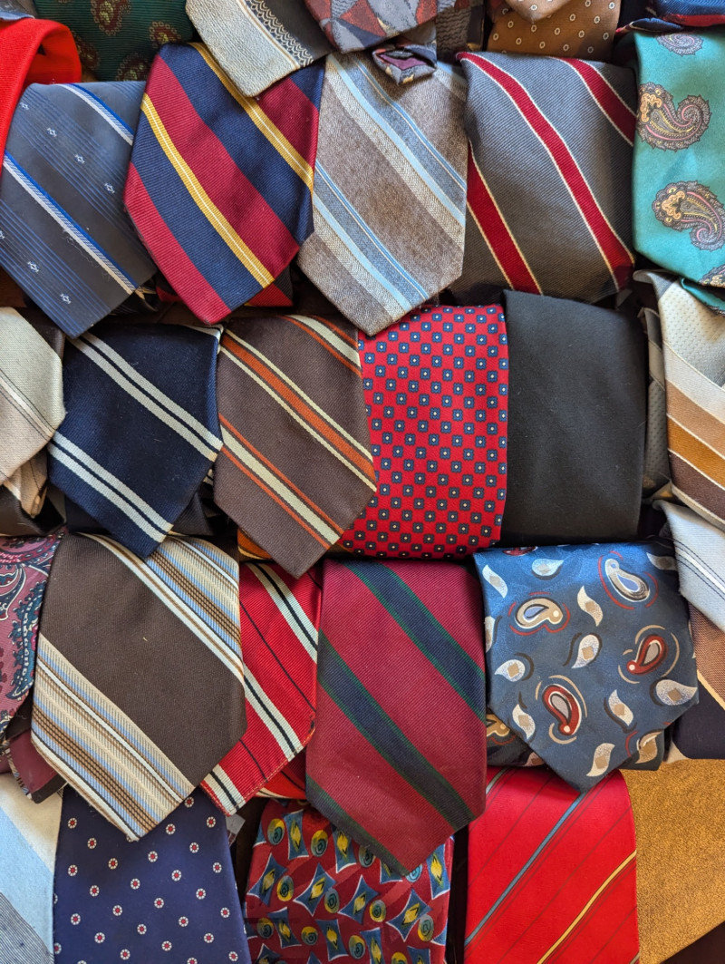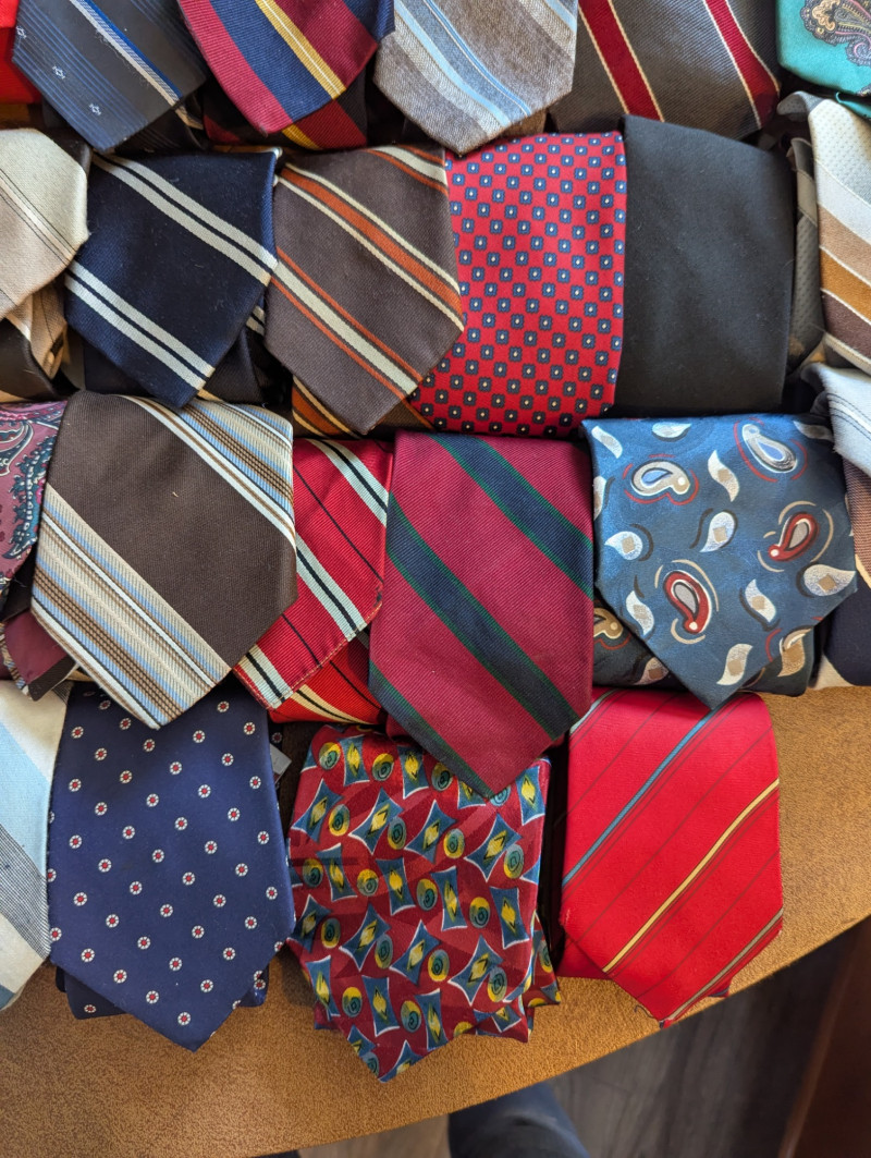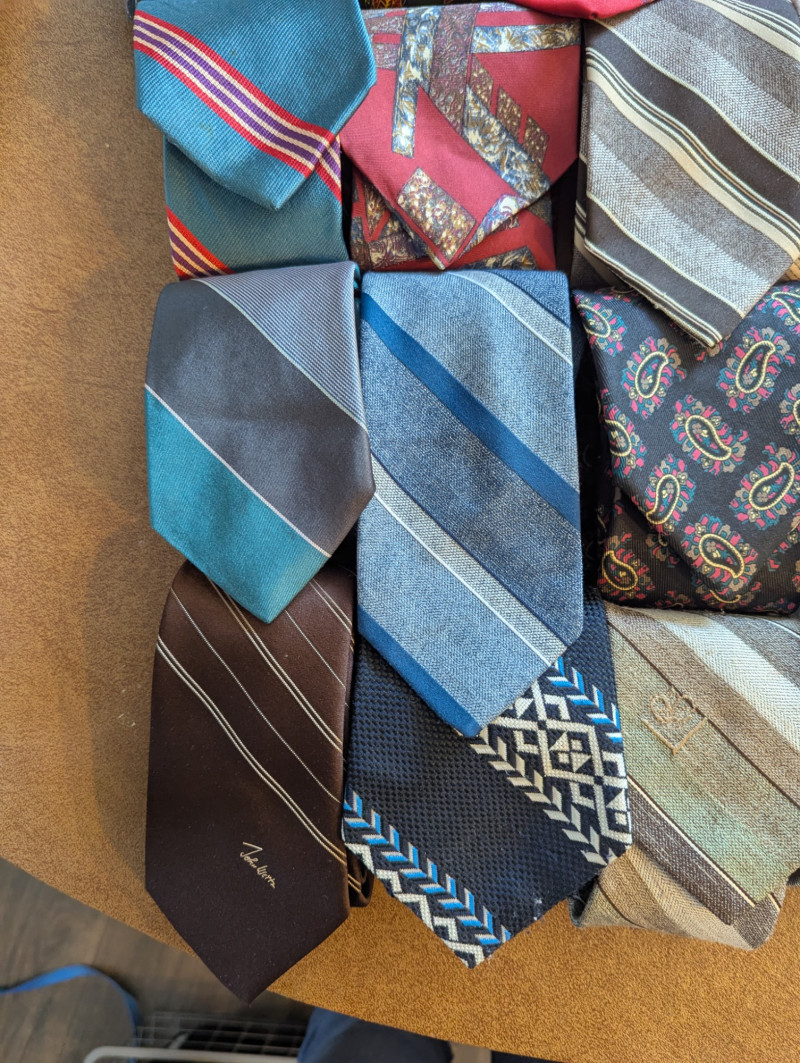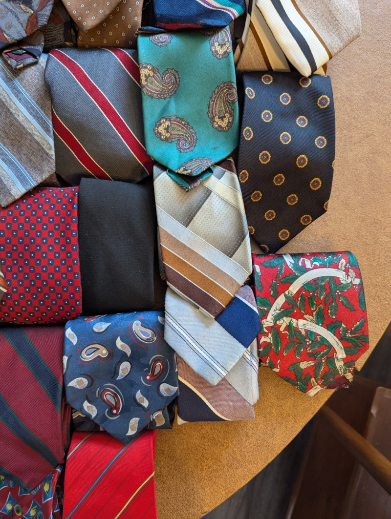 A father or gandfather's dream! 56 neck ties all in good condition. You can have a tie for each day of the month! These would also be great for any fabric savvy folks who can turn them into hairties, sunglass holders, skirts or use them in scrapbooking.