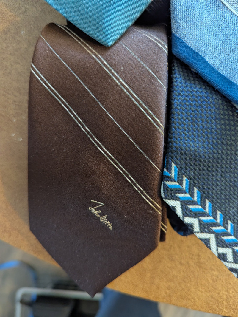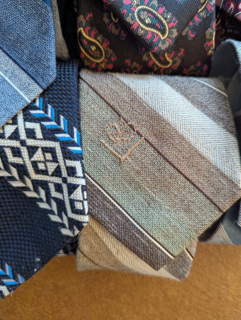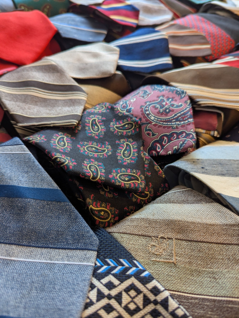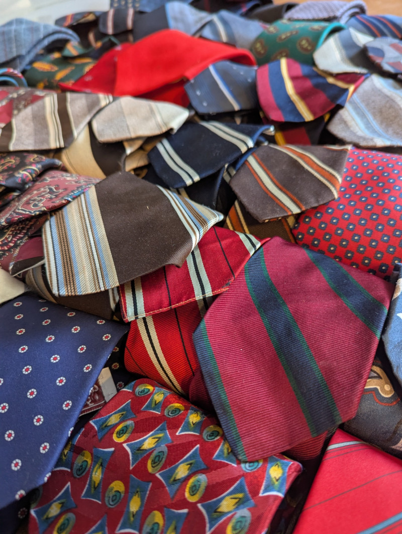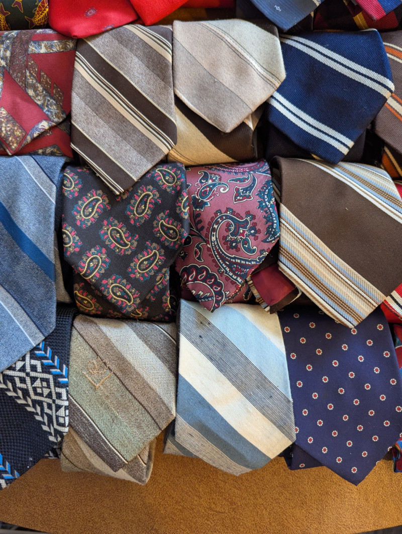 A father or gandfather's dream! 56 neck ties all in good condition. You can have a tie for each day of the month! These would also be great for any fabric savvy folks who can turn them into hairties, sunglass holders, skirts or use them in scrapbooking.