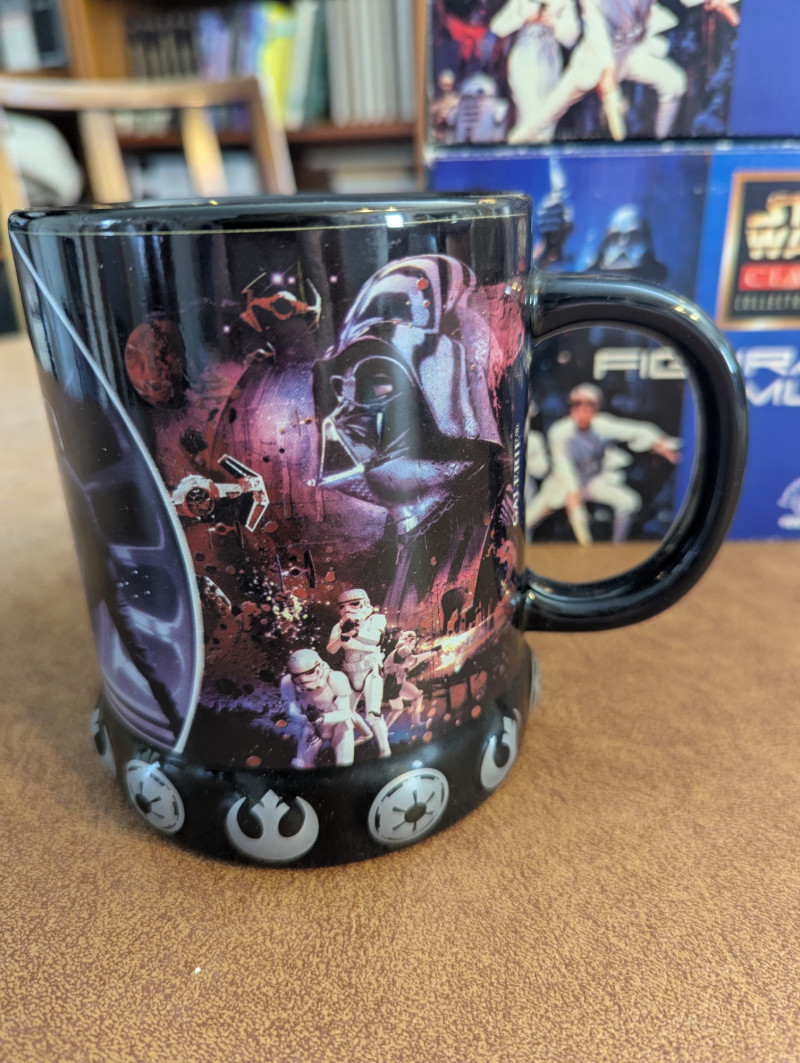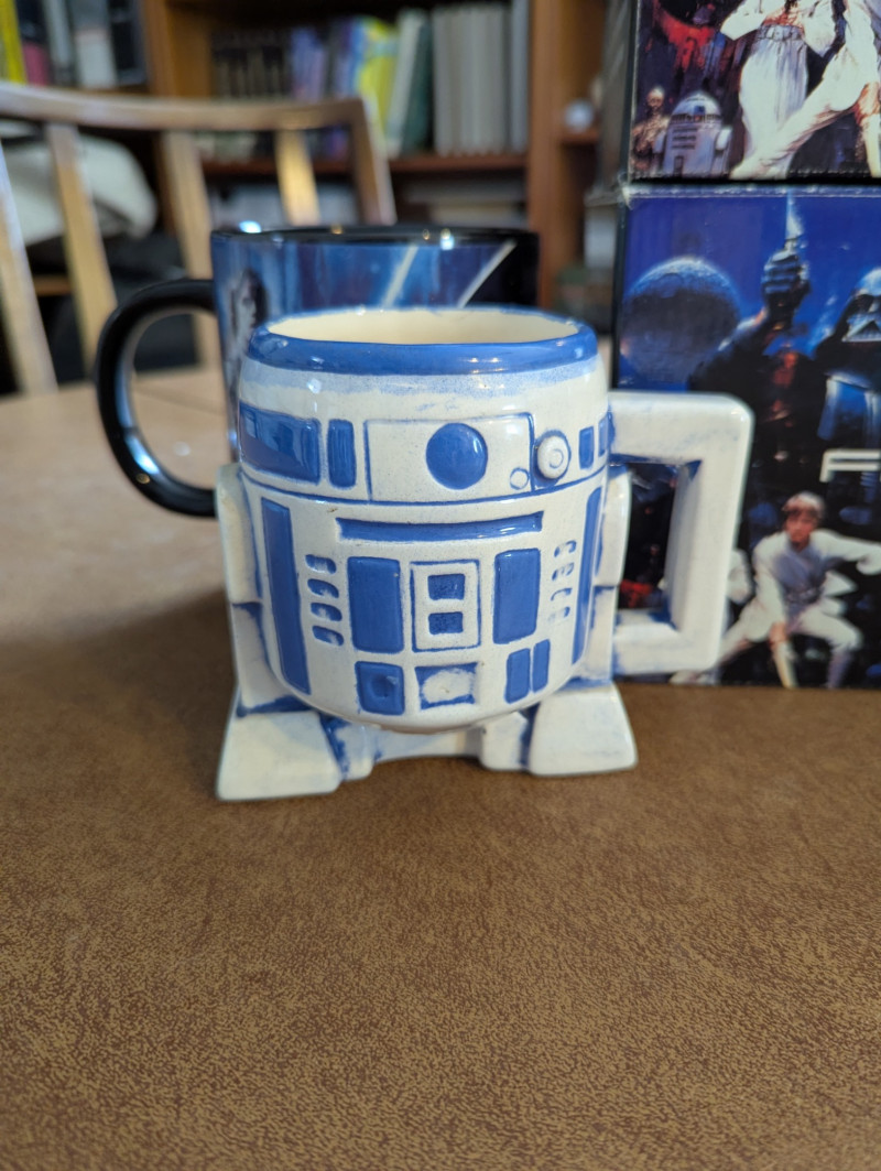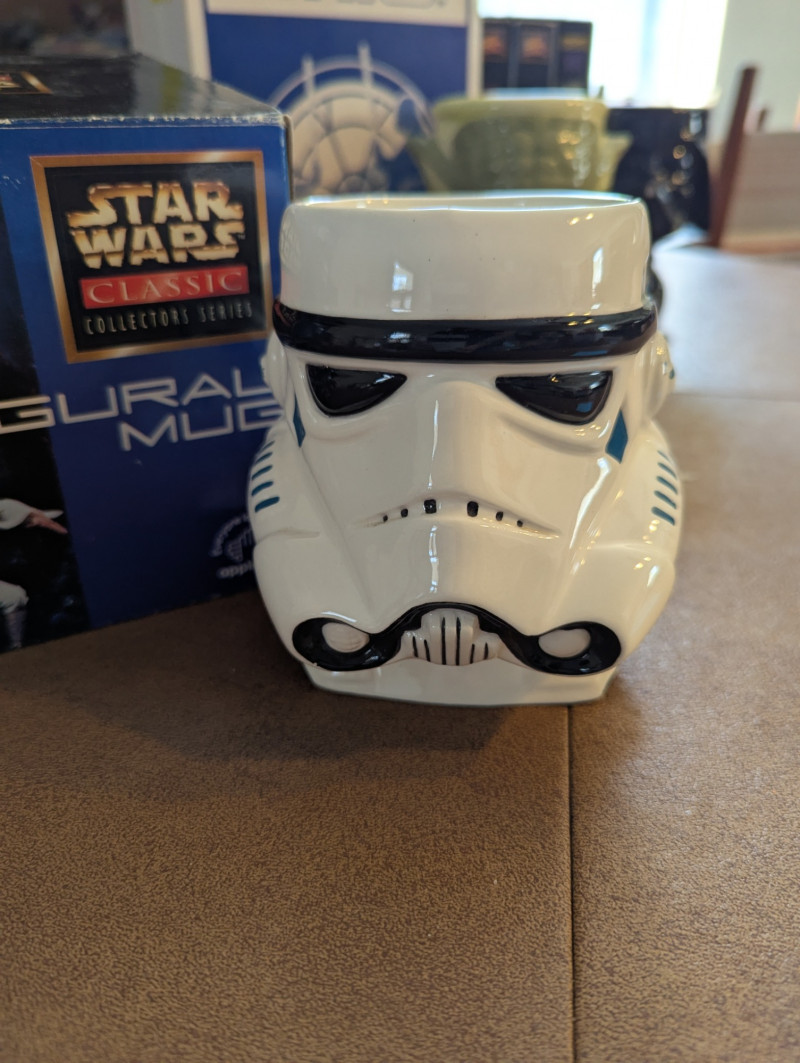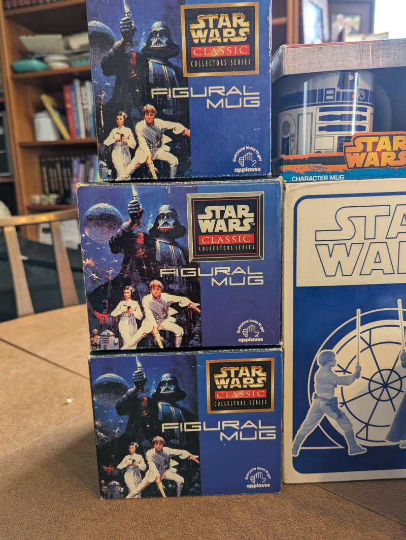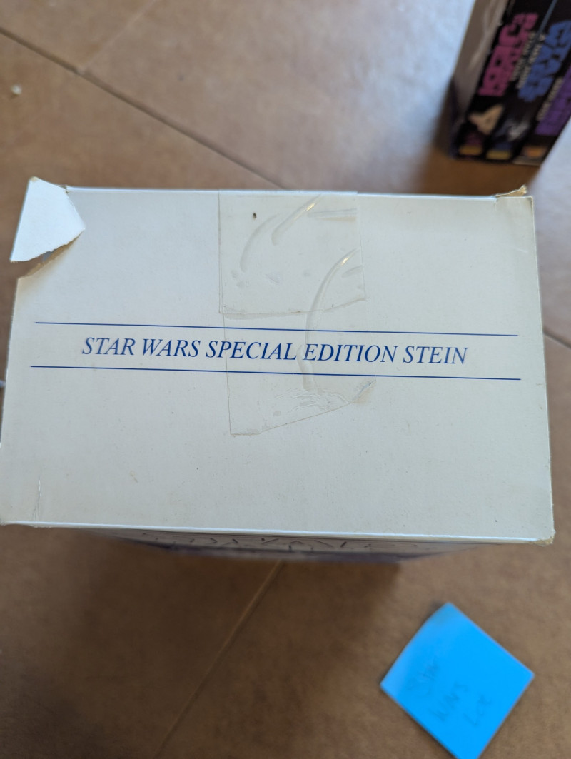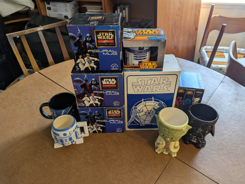 A Star Wars lover's coffee bar dream! They've never been used and all in great condition. And they come with the original 4,5,6 VHS set! Enjoy geeking out by sipping some blue milk out of one these awesome mugs. The beer stein is our personal favorite!