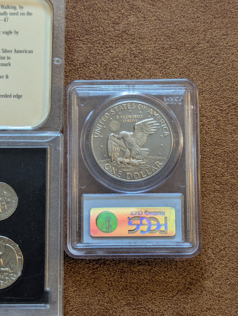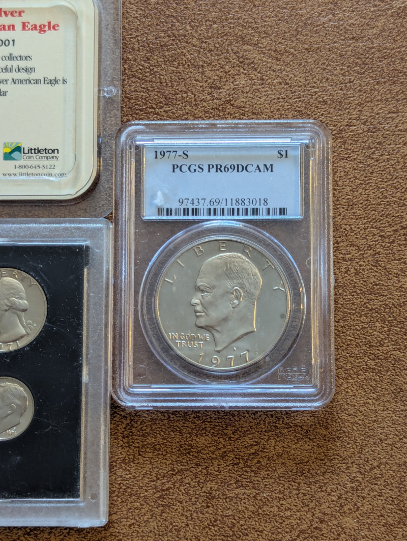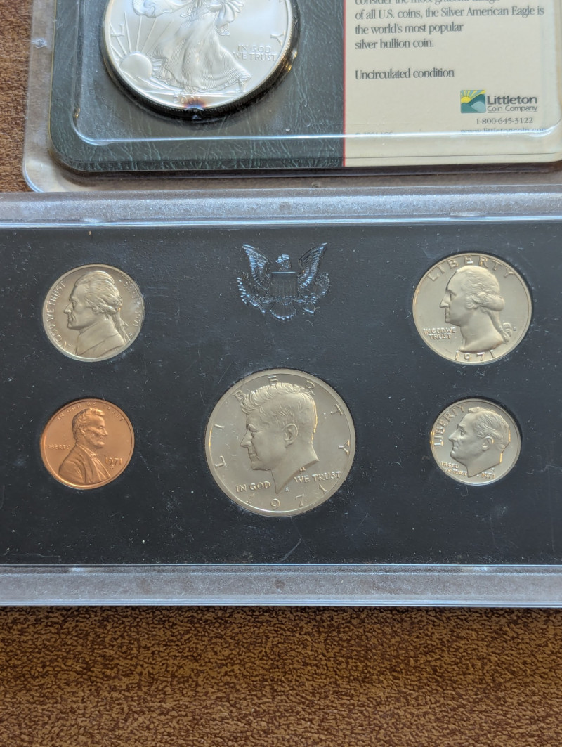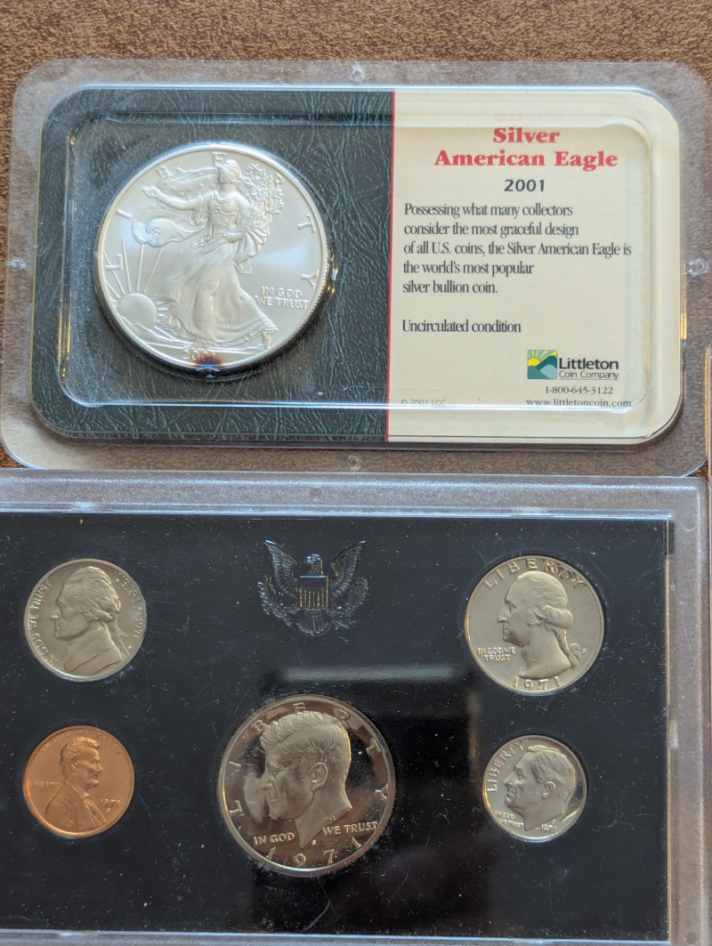 Mint condition, 1971 American coin collection, 1977 One Dollar Coin and 2001 Silver American Eagle coin.
