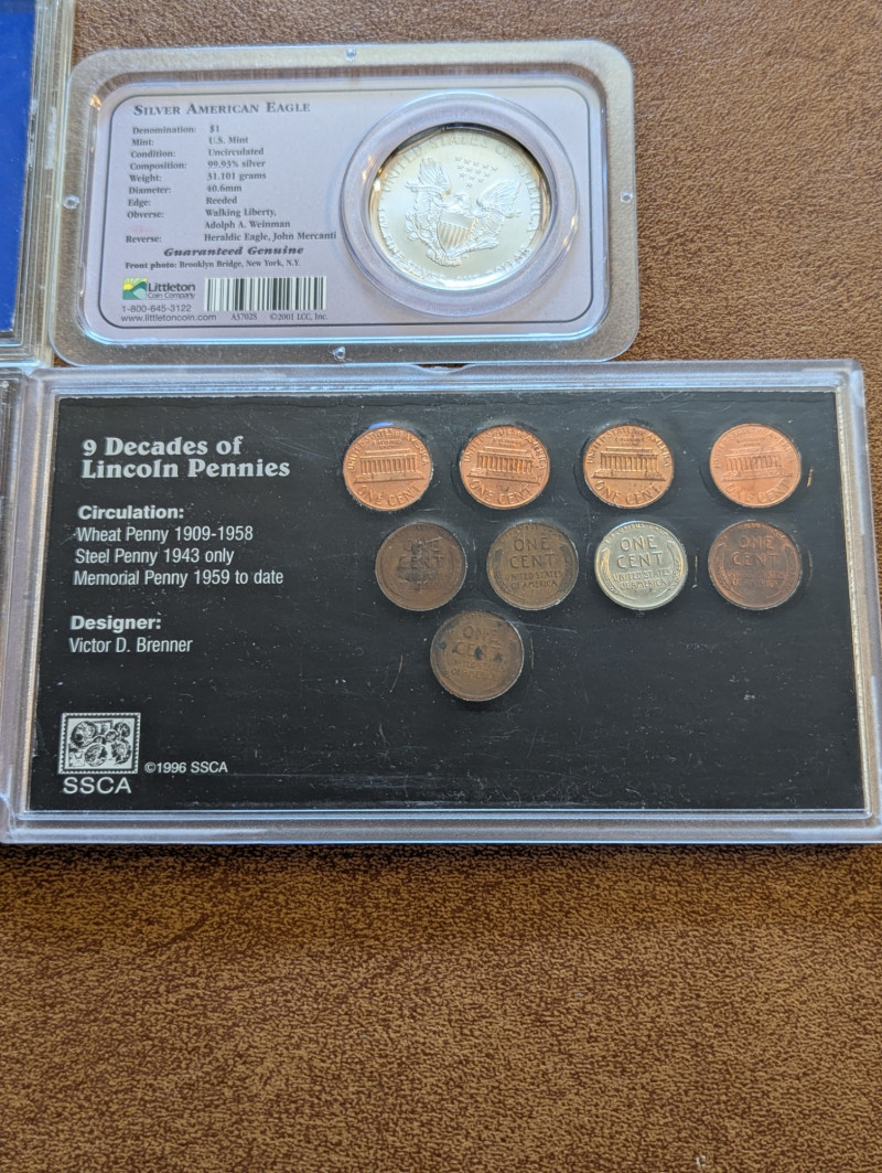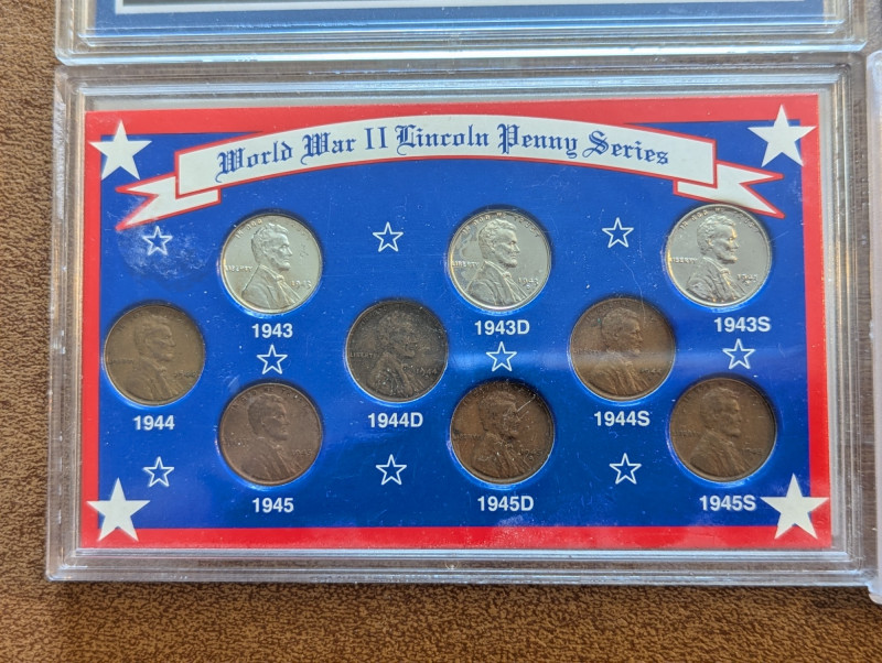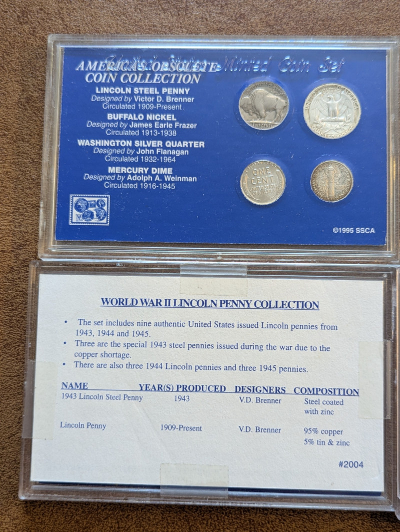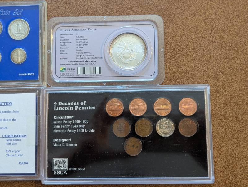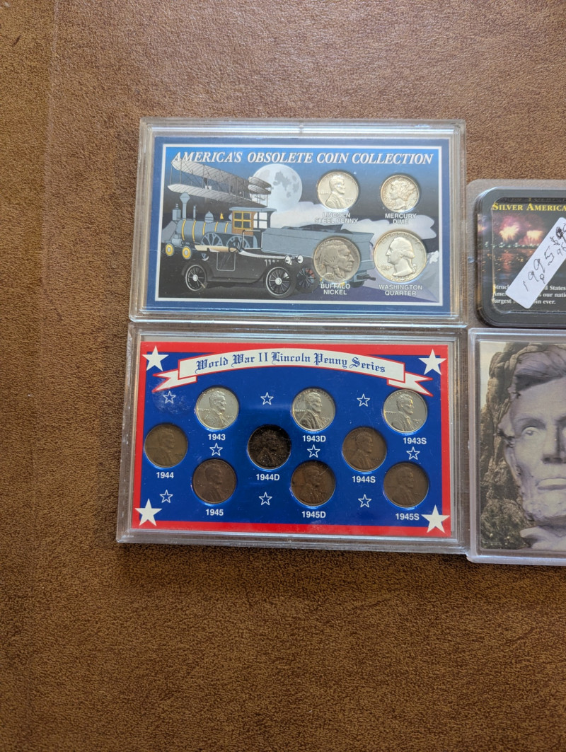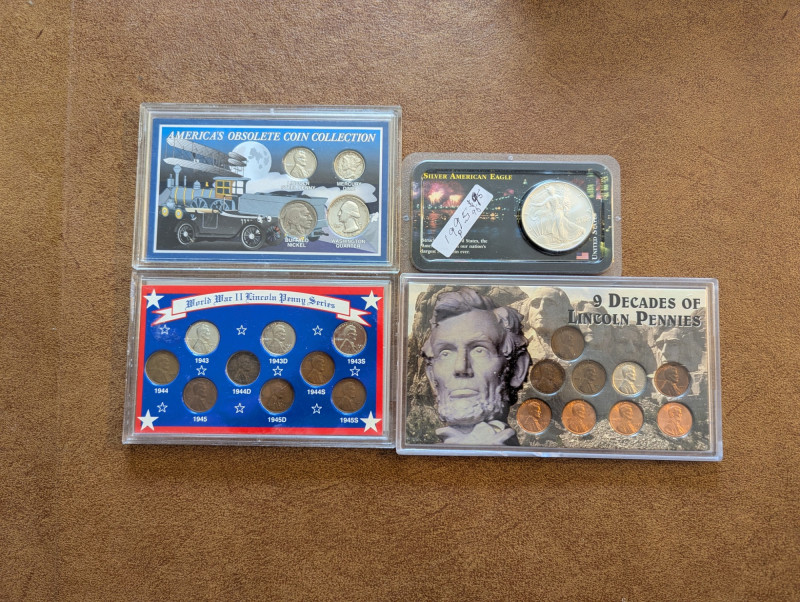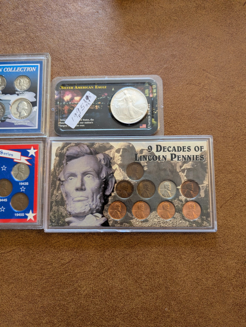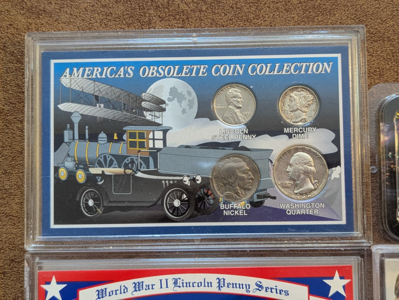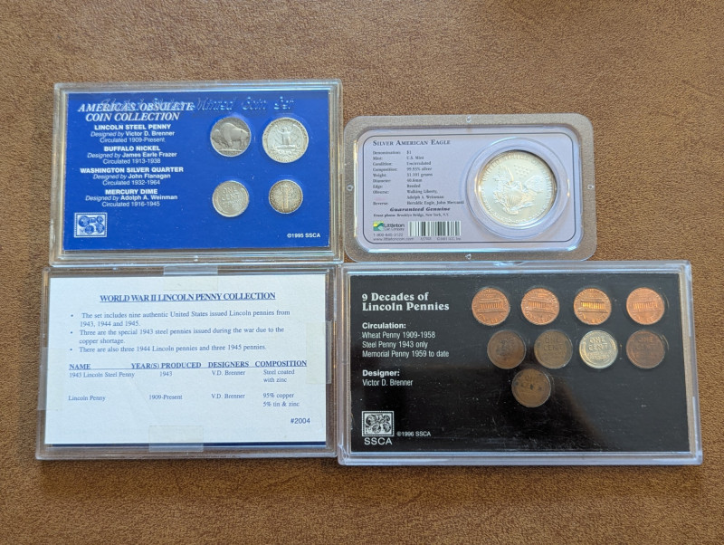 This collection has a rare obsolete set of American coins that include the: Lincoln steel penny, Mercury dime and Buffalo nickel. As well as a collection of pennies from the 1930s - 1990s and a 1995 Silver American Eagle Coin. All perfectly sealed in thick plastic ensuring the safety of the coins.
