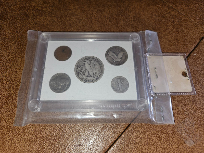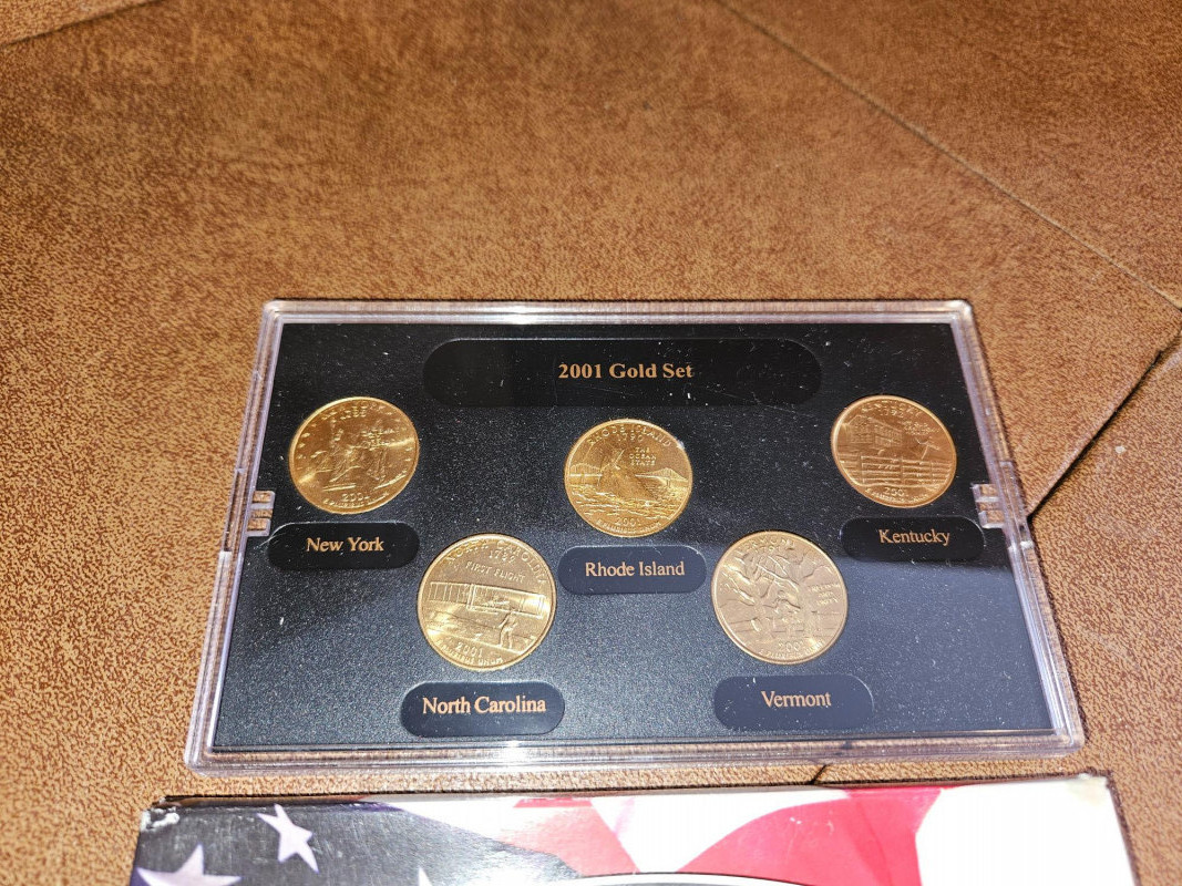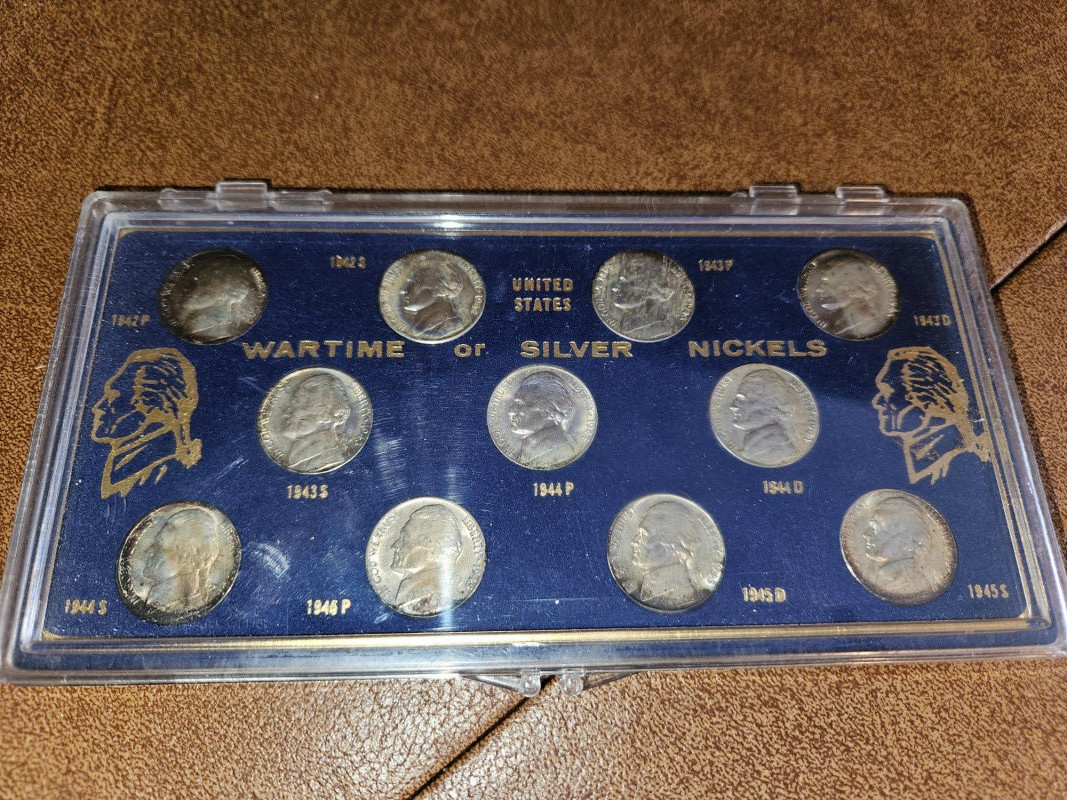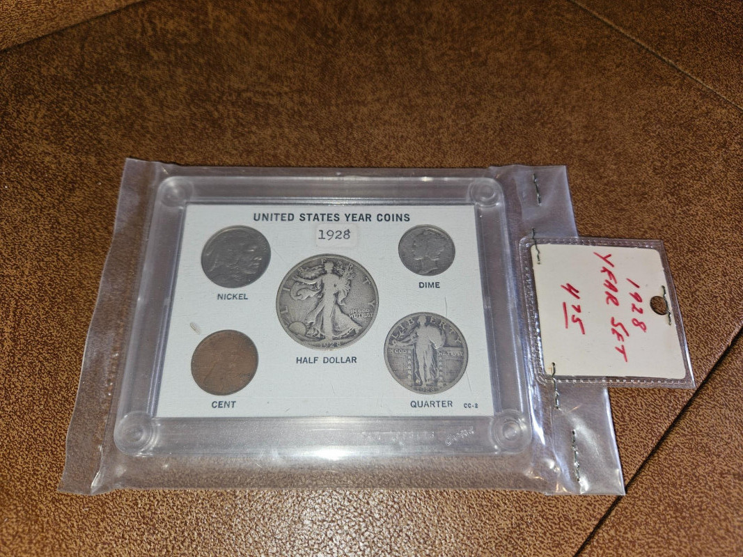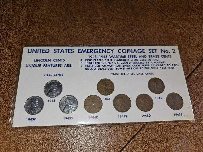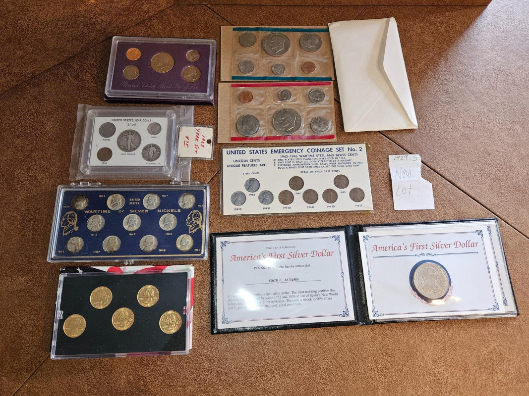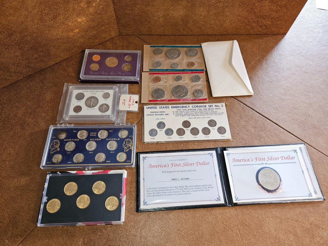 In this lot we have: United States Emergency Coinage Set No.2 made up of steel and brass (or shell) pennies 1928 Year coin set. 2001 gold quarter set. Wartime silver nickels. 1993 Year coin set. 1978 uncirculated coin set. and America's first silver dollar. All sealed in some form of plastic, ensuring the coins are safe from oils and dirt.